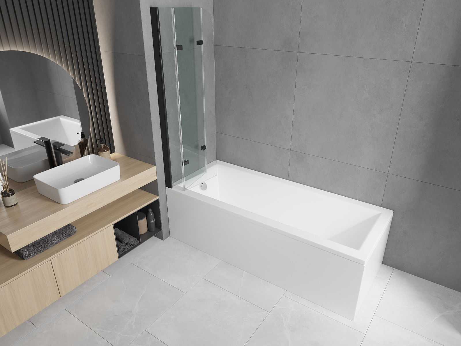 Pantalla hecha de tres alas con opción de plegado. Esta solución permite ahorrar más espacio en el baño y permite el uso libre del espacio restante cuando no estamos utilizando la zona de baño.