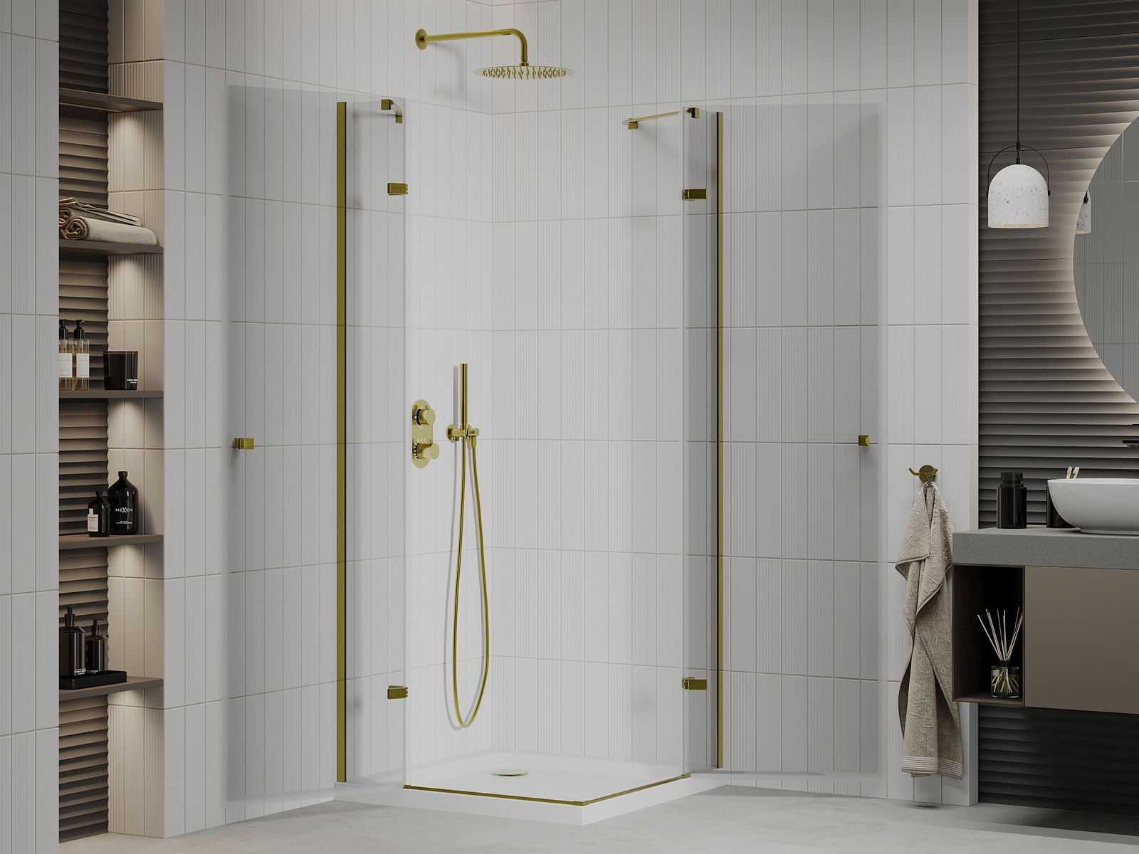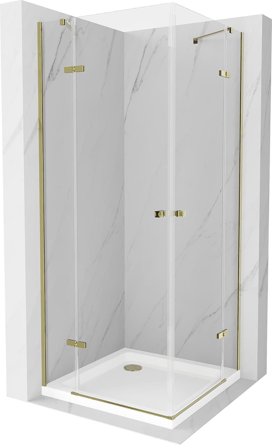 Mexen Roma Duo cabina de ducha abatible 90 x 90 cm, transparente, dorada + plato de ducha Flat - 854-090-090-50-02-4010G