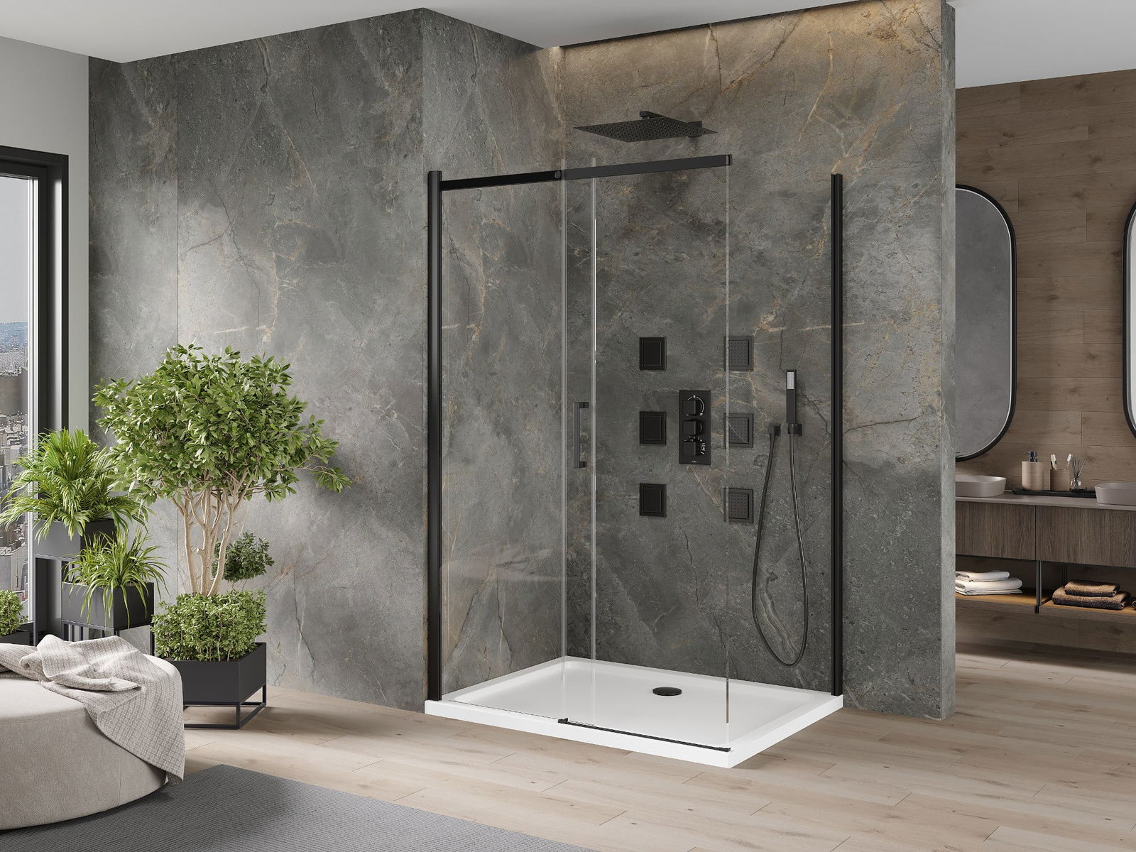 Mexen Omega cabina de ducha corredera 120 x 80 cm, transparente, negra + plato de ducha Flat, blanco - 825-120-080-70-00-4010B
