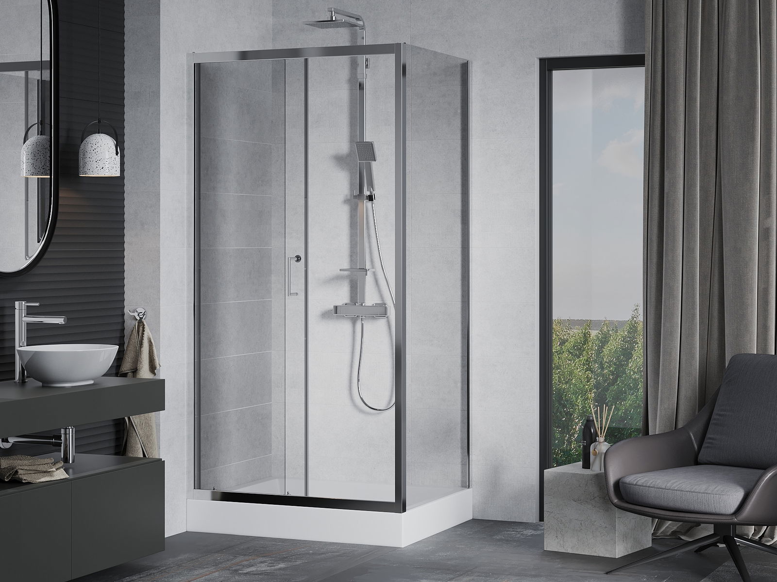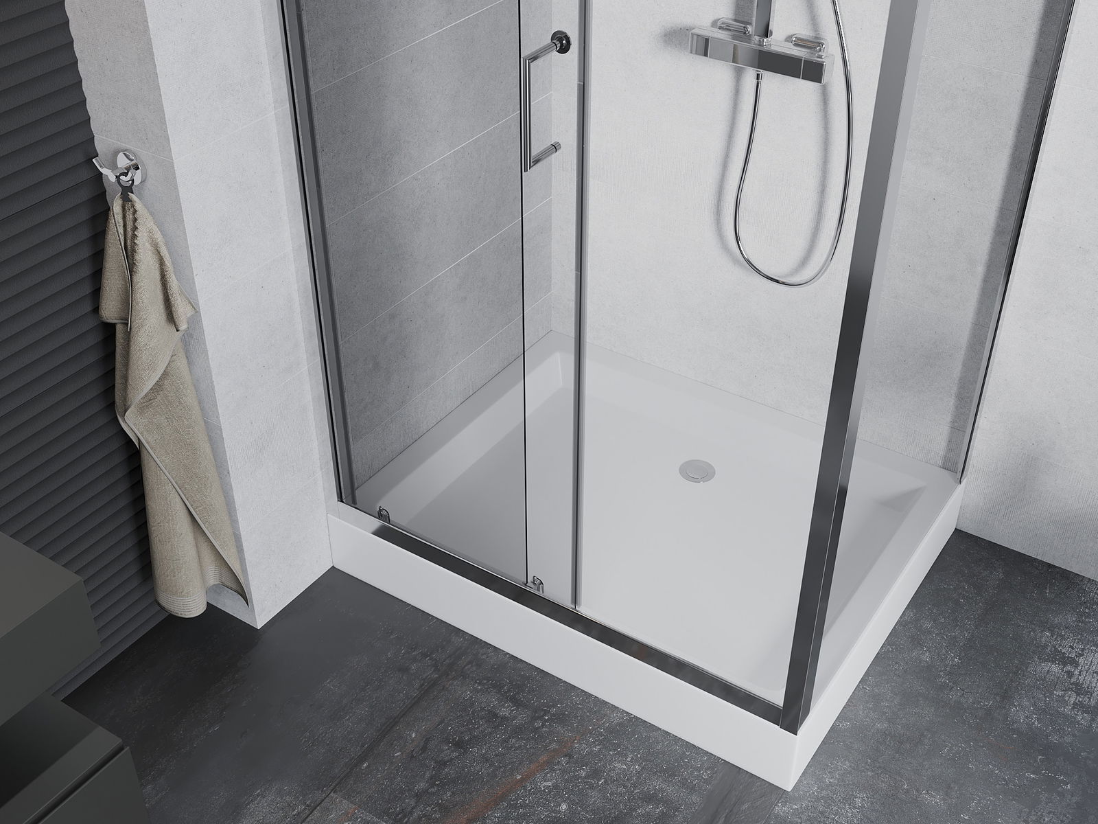 Un asa práctico y cómodo hecho de metal duradero y resistente. La forma moderna combinada con un acabado que se adapta al color de los perfiles le da a todo un aspecto moderno y estilizado, destacando la estética de cada baño.