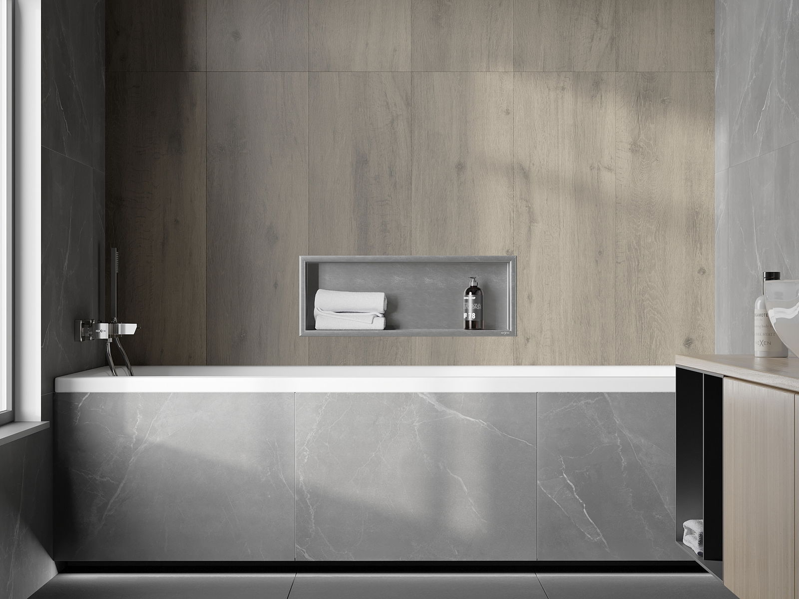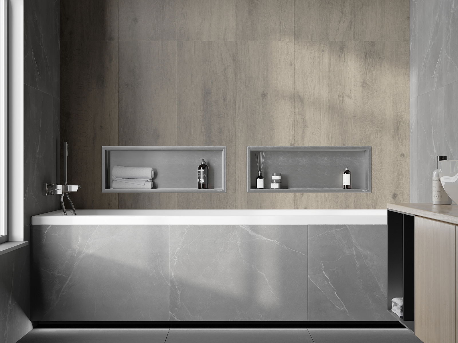 Posibilidad de montaje en la pared o en una construcción especialmente preparada. Es una solución extremadamente moderna y funcional, que permite ahorrar espacio y adaptar el producto a la estética del interior y crear una composición coherente.