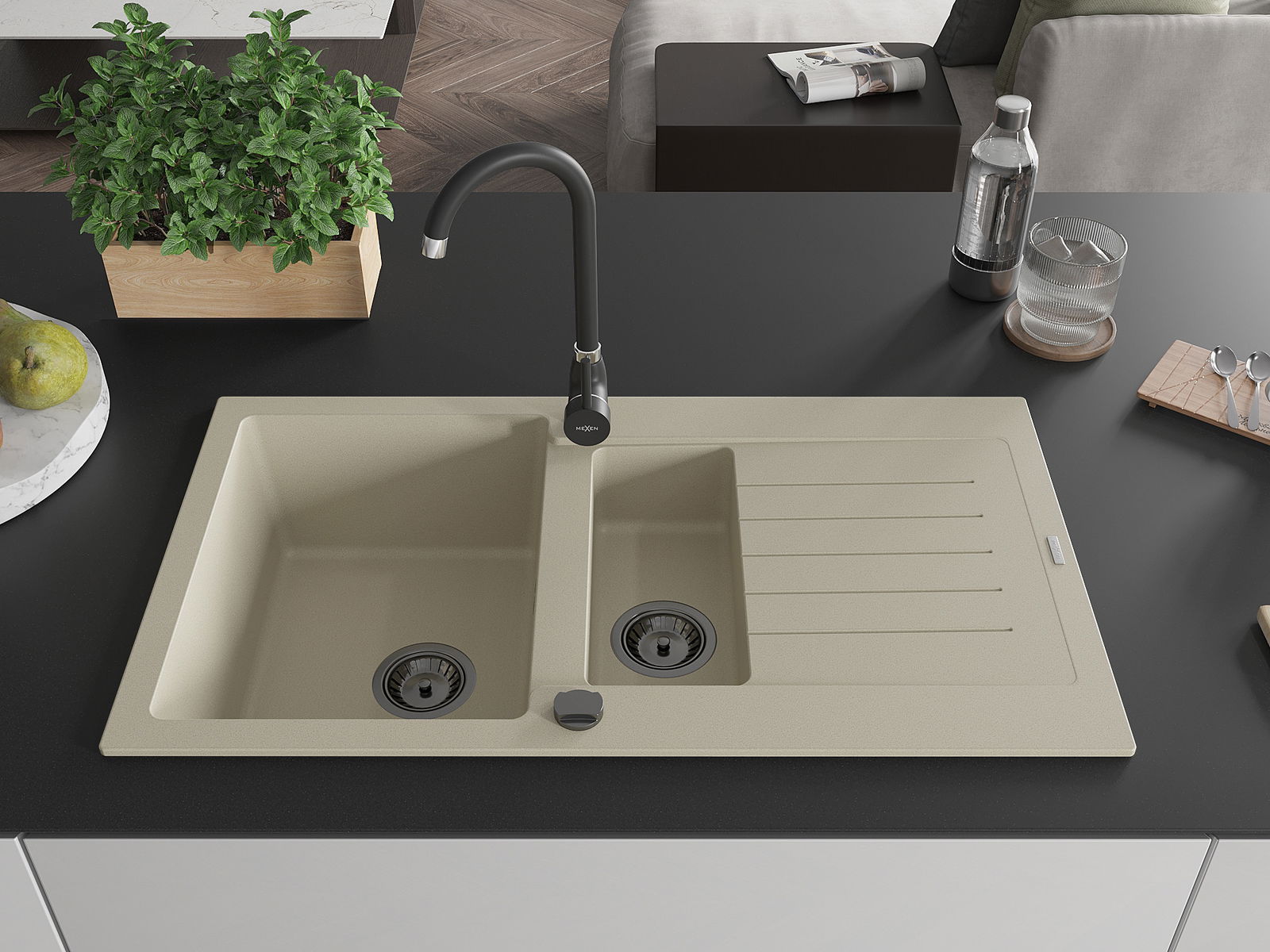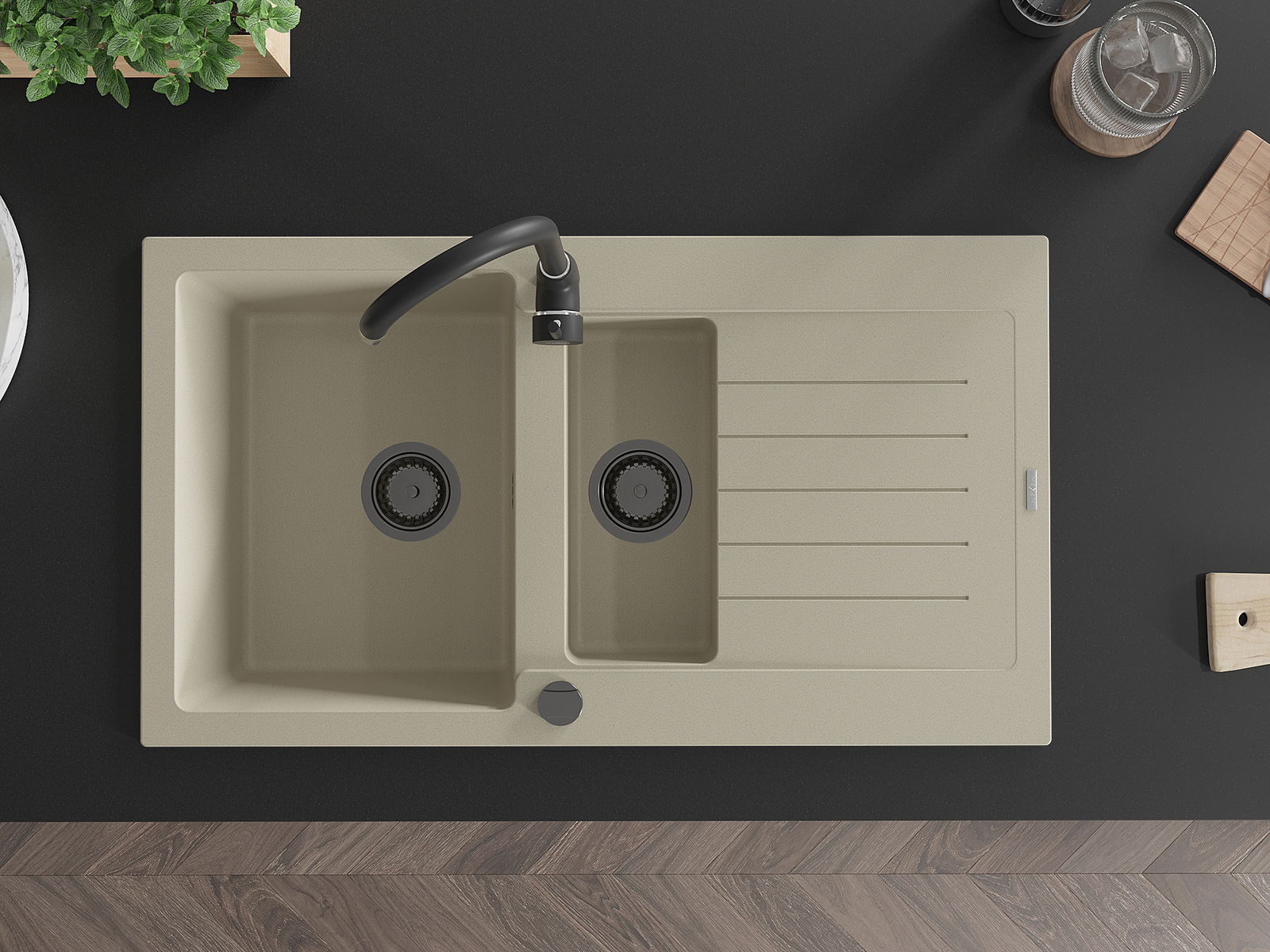El fregadero está hecho de granito de alta calidad. Es un complemento elegante y, sobre todo, práctico para cualquier cocina, independientemente de su estilo. La alta calidad y durabilidad del granito aseguran un uso prolongado durante años.
