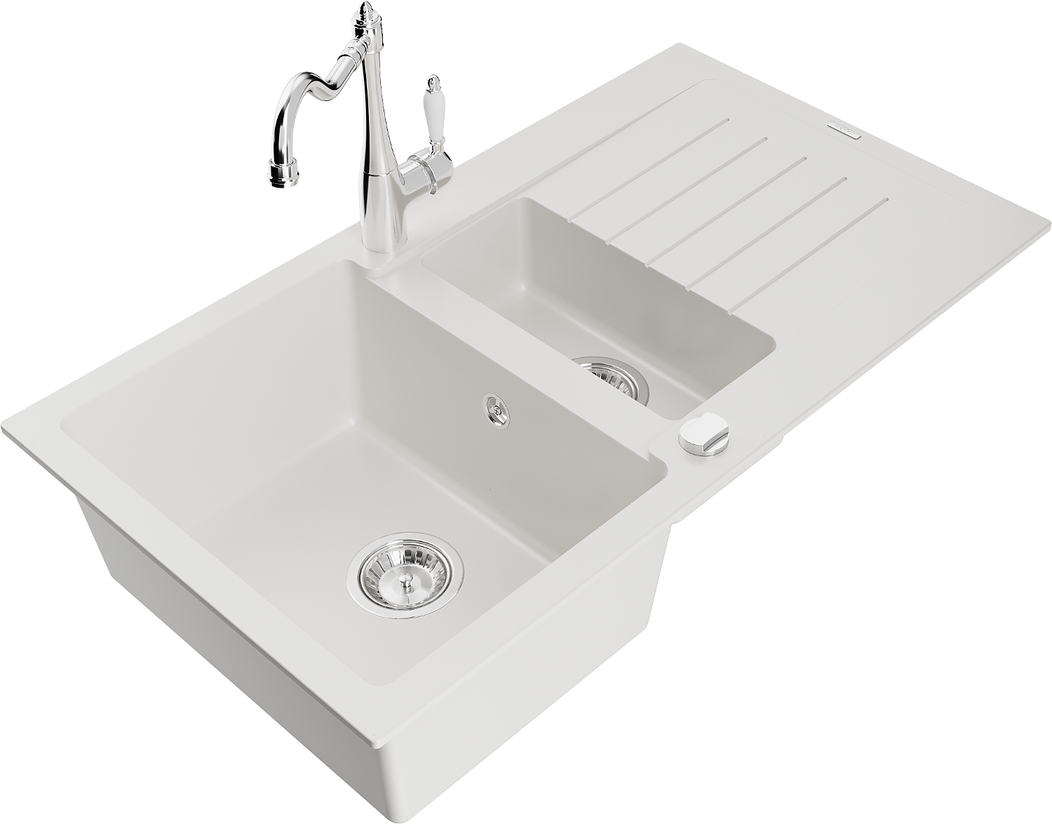 Mexen Matias fregadero de granito 1,5 senos con escurridor y grifo de cocina Carla, blanco - 6502-20-670700-00