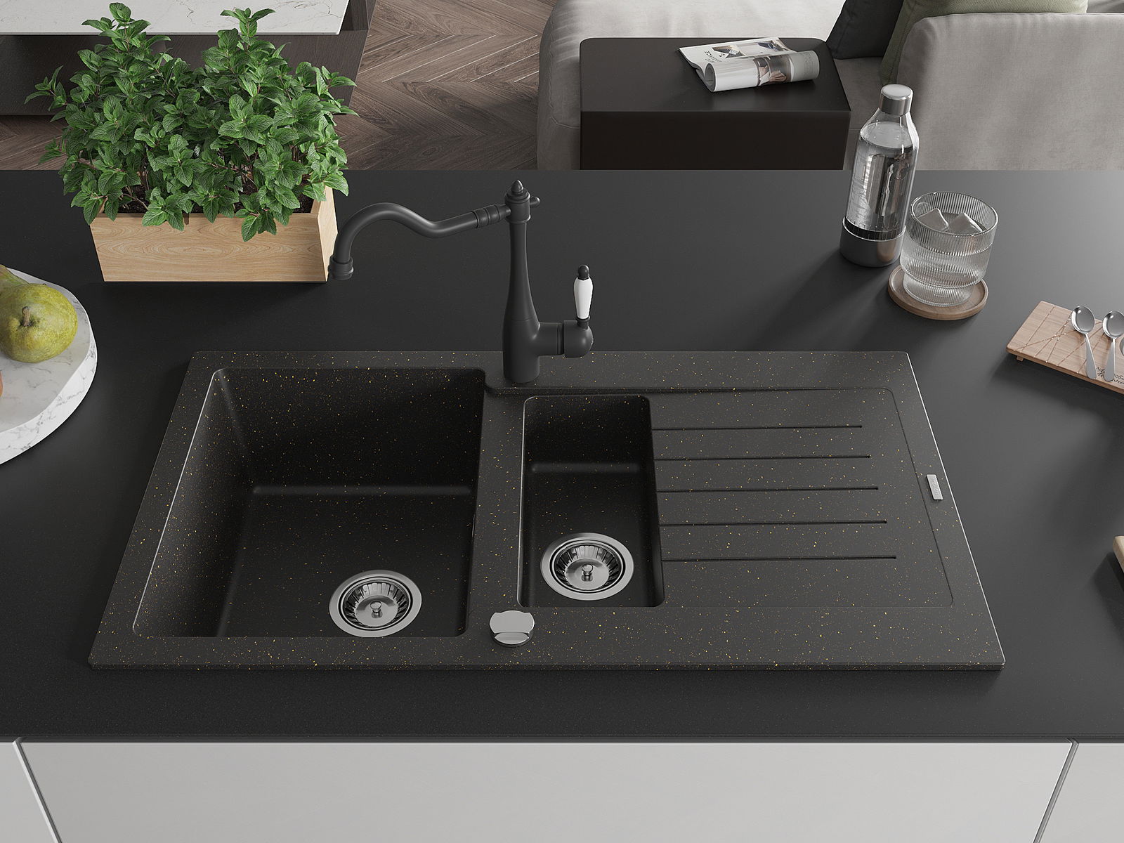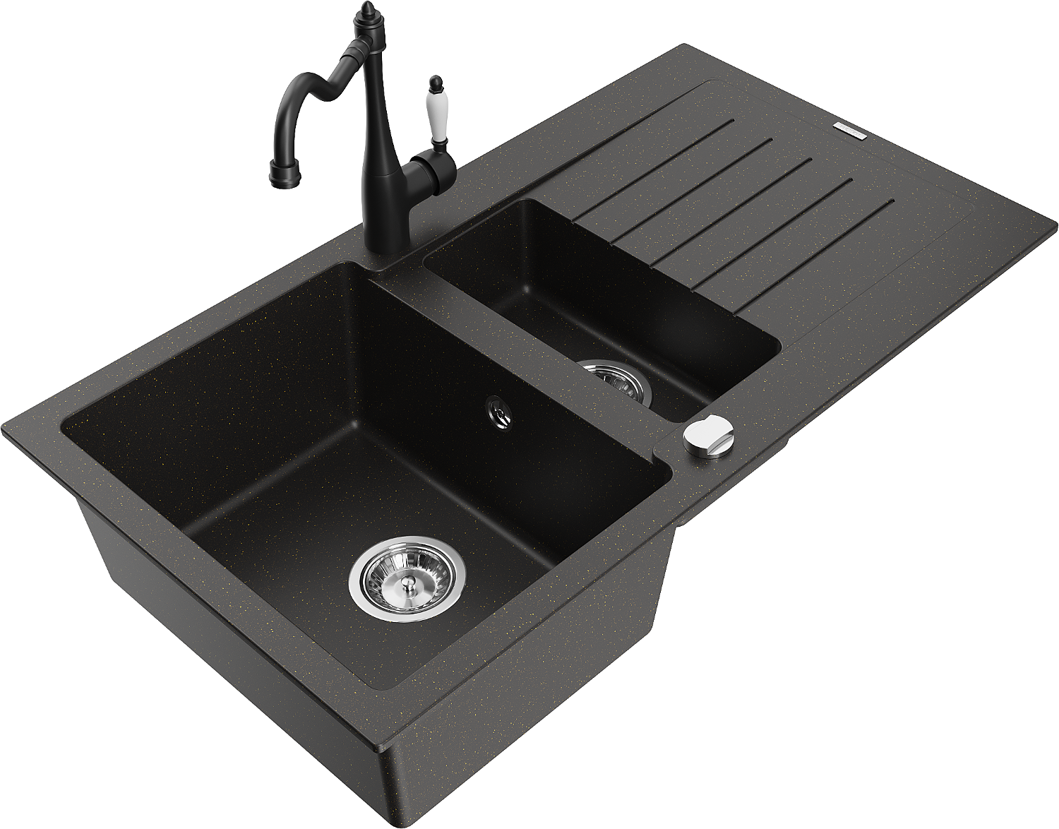 Mexen Matias fregadero de granito de 1,5 senos con escurridor y grifo de cocina Carla negro/dorado metálico - 6502-75-670700-70