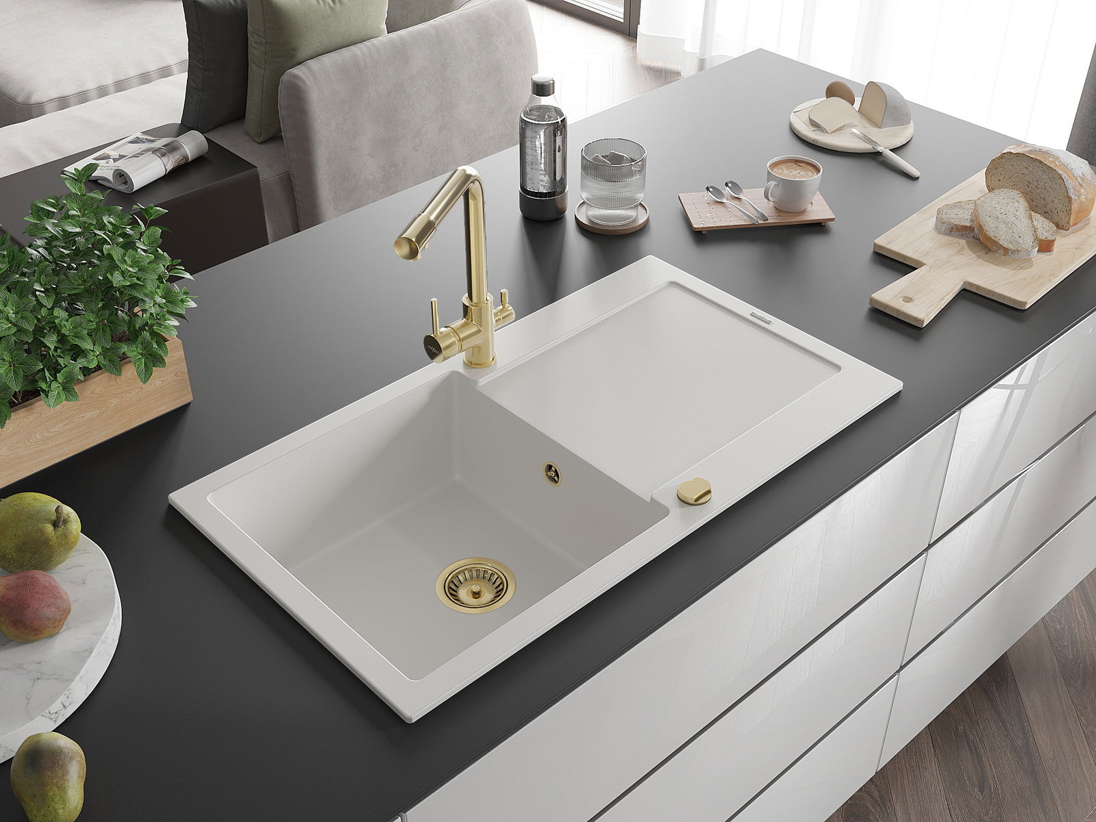 El fregadero está hecho de granito de alta calidad. Constituye un complemento elegante y, sobre todo, práctico para cualquier cocina, independientemente de su estilo. La alta calidad y durabilidad del granito aseguran un uso durante muchos años.