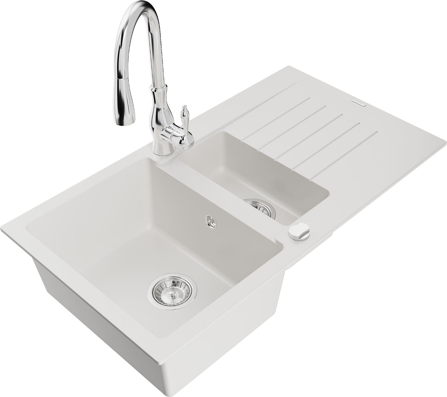 Mexen Matias fregadero de granito 1,5 senos con escurridor y grifo de cocina Savita, blanco - 6502-20-672601-00