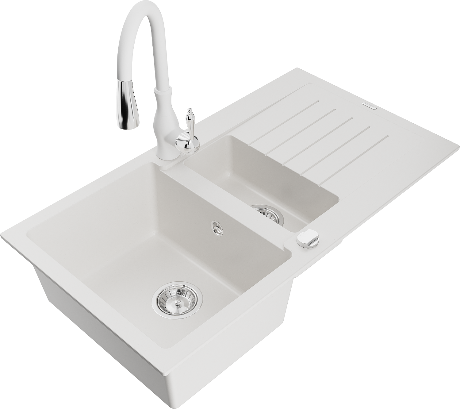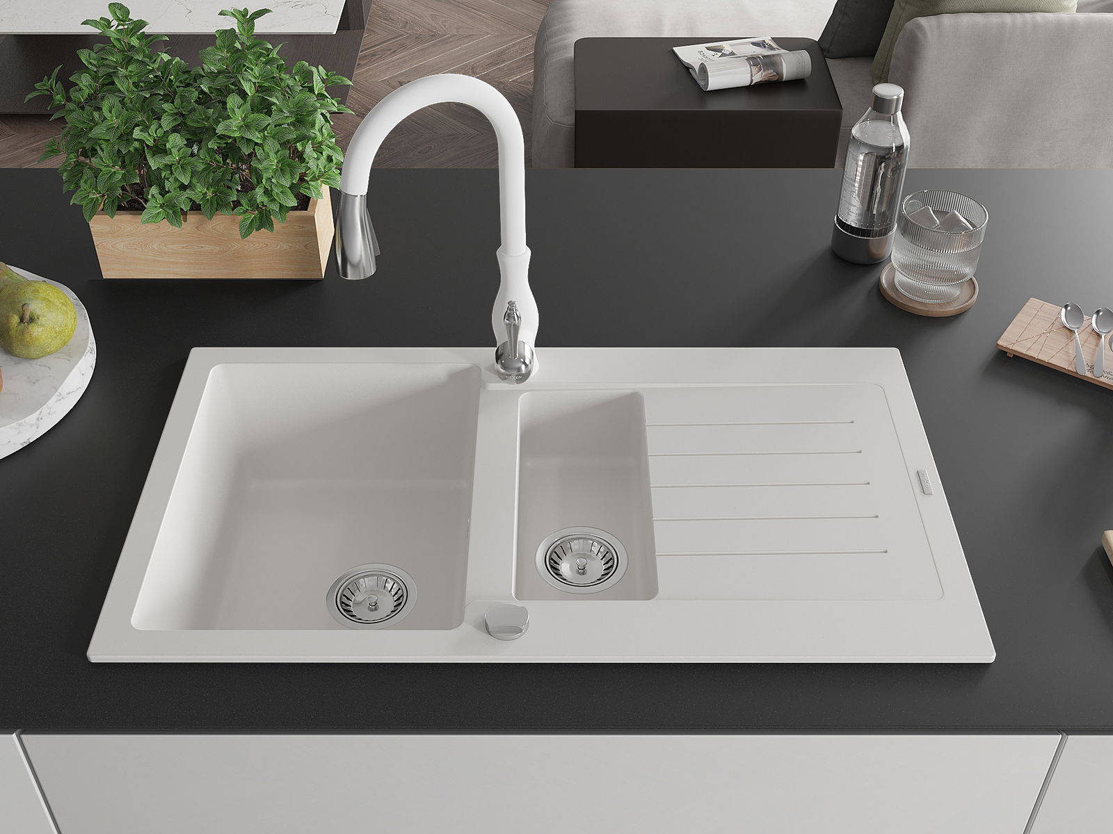 Mexen Matias fregadero de granito de 1,5 tazones con escurridor y grifo de cocina Savita, blanco - 6502-20-672601-20