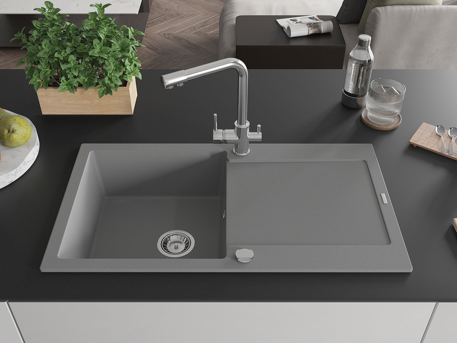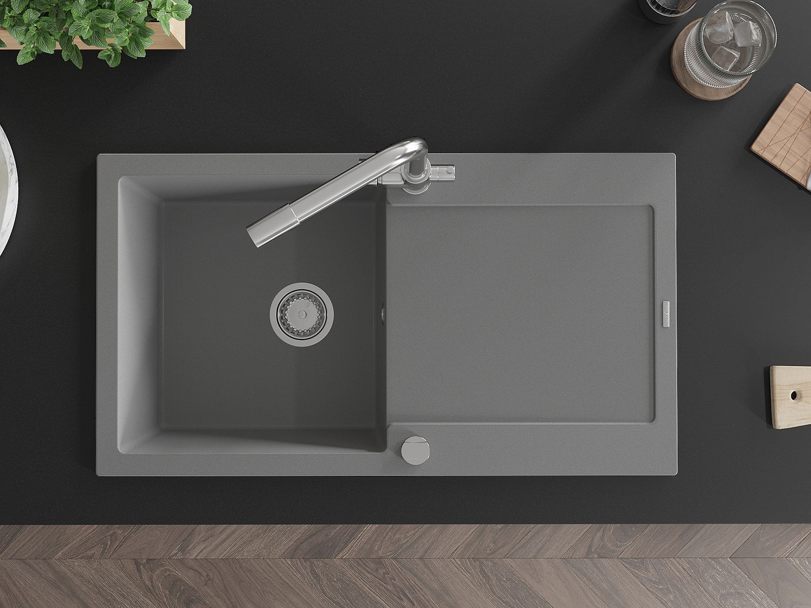 El fregadero está hecho de granito de alta calidad. Constituye un complemento elegante y, sobre todo, práctico para cualquier cocina, independientemente de su estilo. La alta calidad y durabilidad del granito aseguran un uso durante muchos años.
