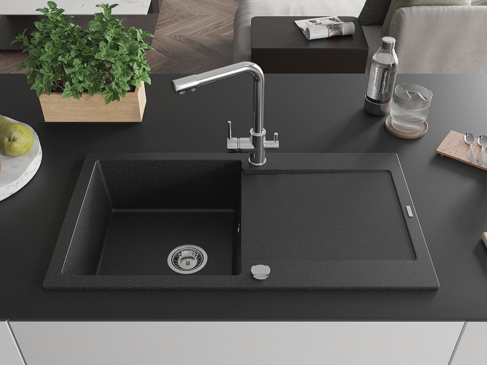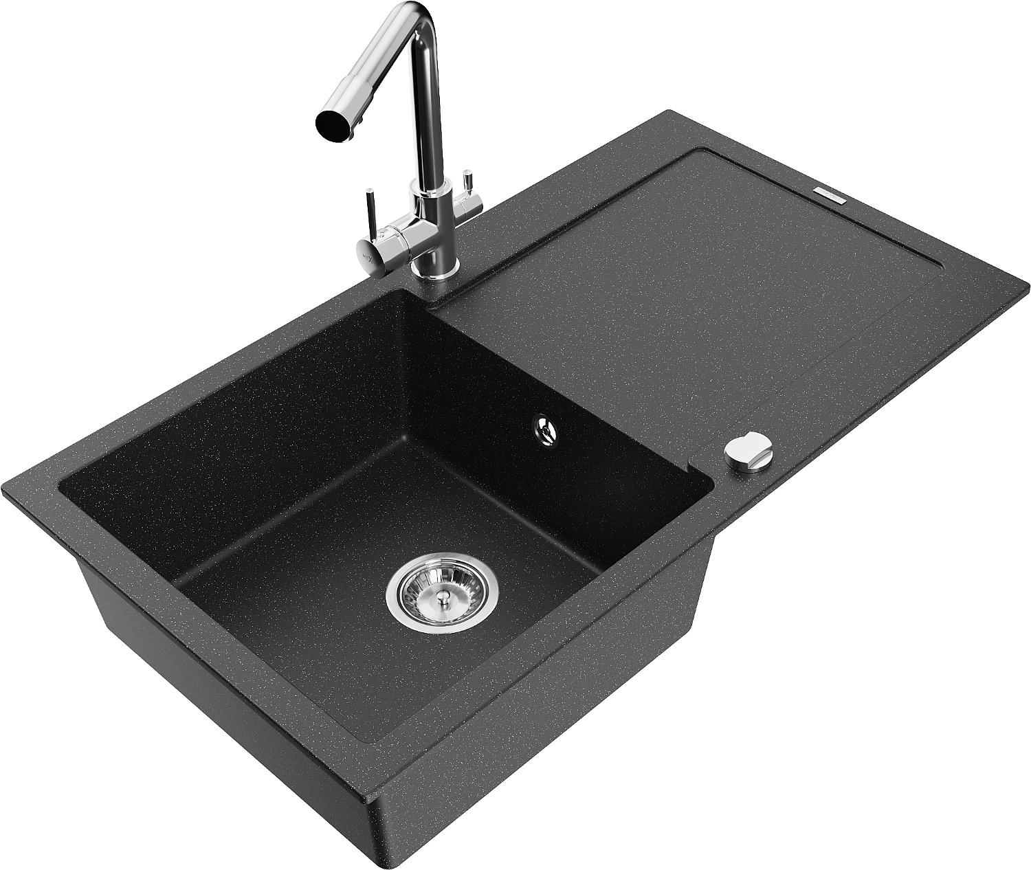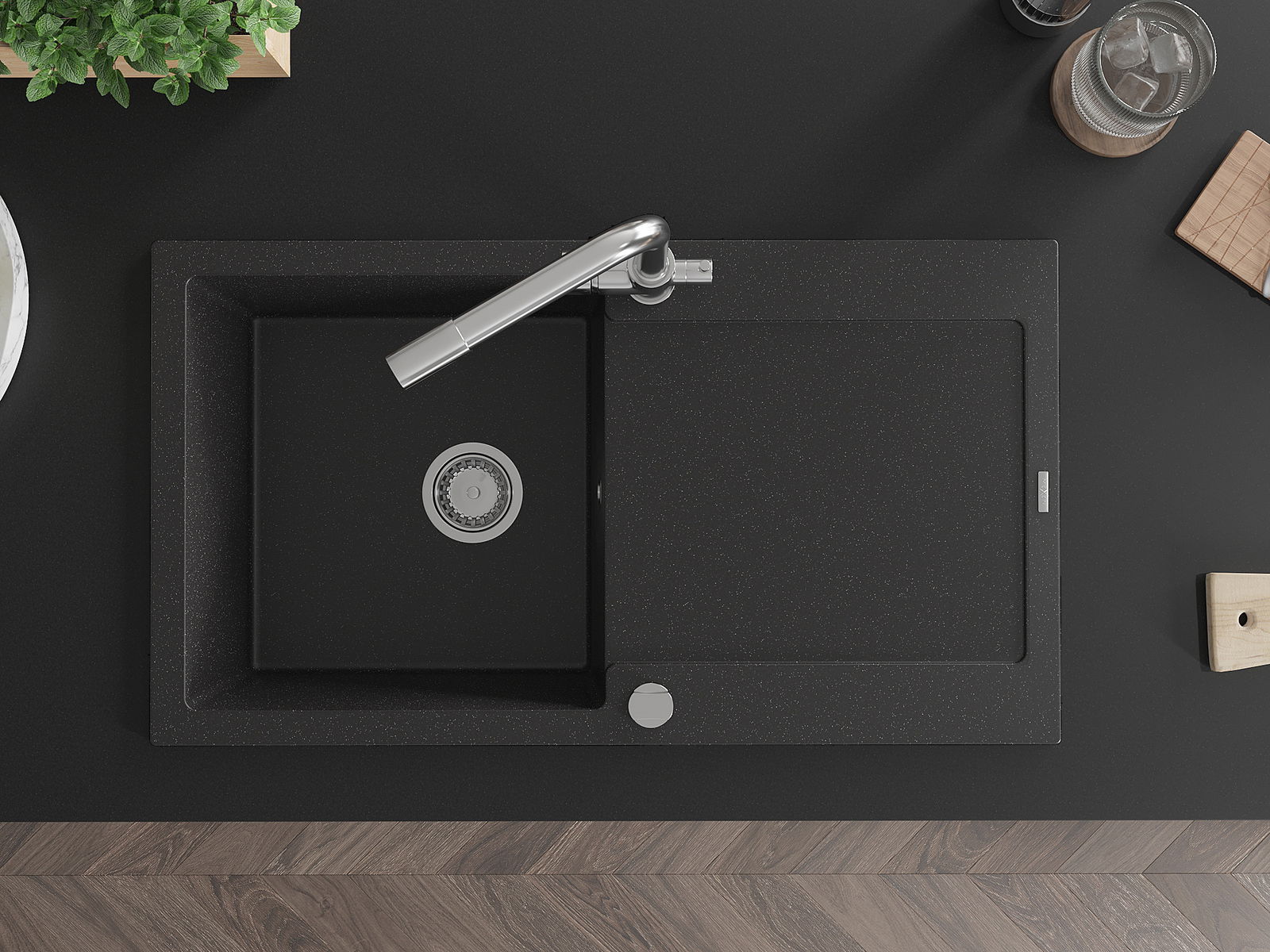 El fregadero está hecho de granito de alta calidad. Es un complemento elegante y, sobre todo, práctico para cualquier cocina, independientemente de su estilo. La alta calidad y durabilidad del granito aseguran un uso prolongado durante años.