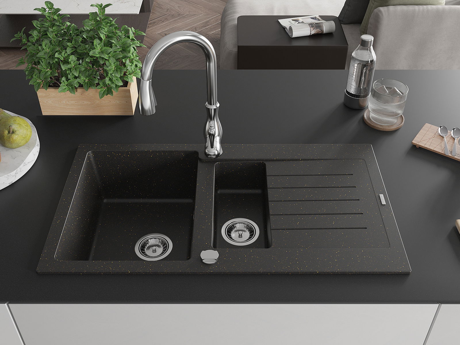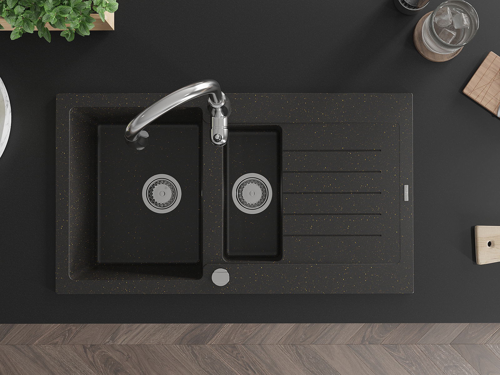 Mexen Matias fregadero de granito de 1,5 tazones con escurridor y grifo de cocina Savita, negro/oro - 6502-75-672601-00