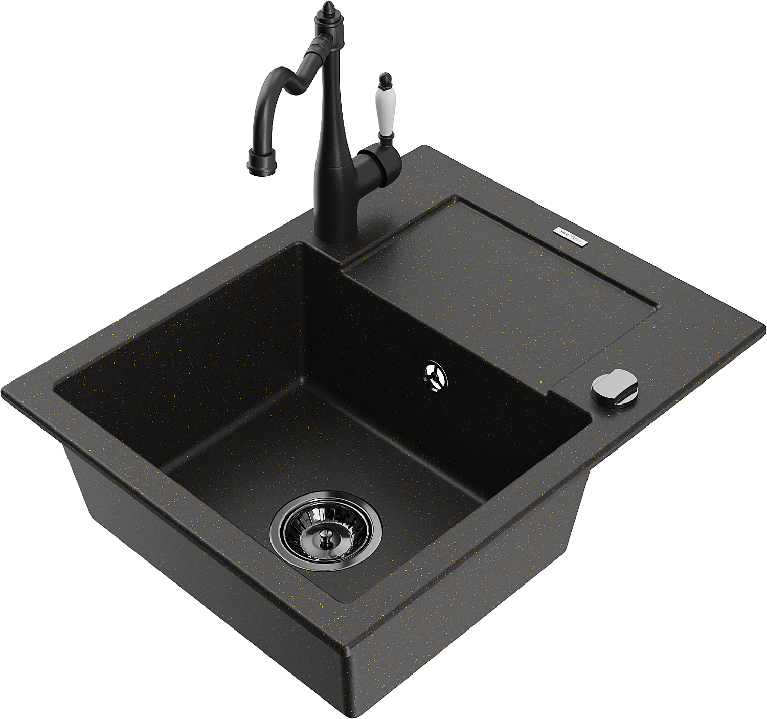 Mexen Enzo fregadero de granito de 1 cubeta con escurridor y grifo de cocina Carla, negro/dorado metálico - 6506-75-670700-70-B