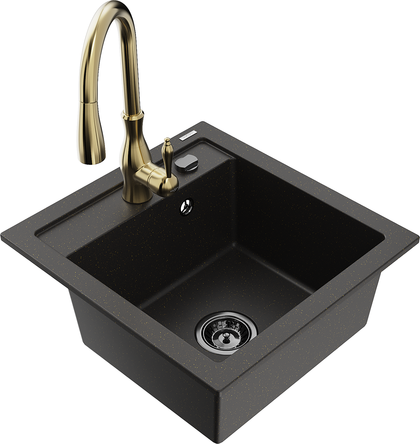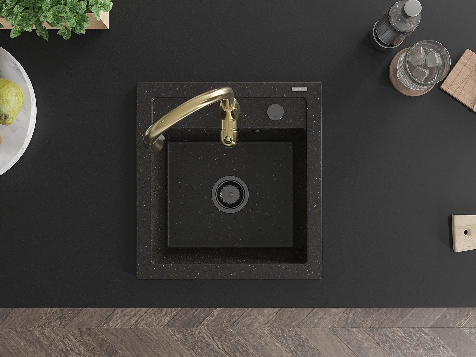 Mexen Vito fregadero de granito de 1 cubeta con grifo de cocina Savita, negro/oro metálico - 6503-75-672601-50-B