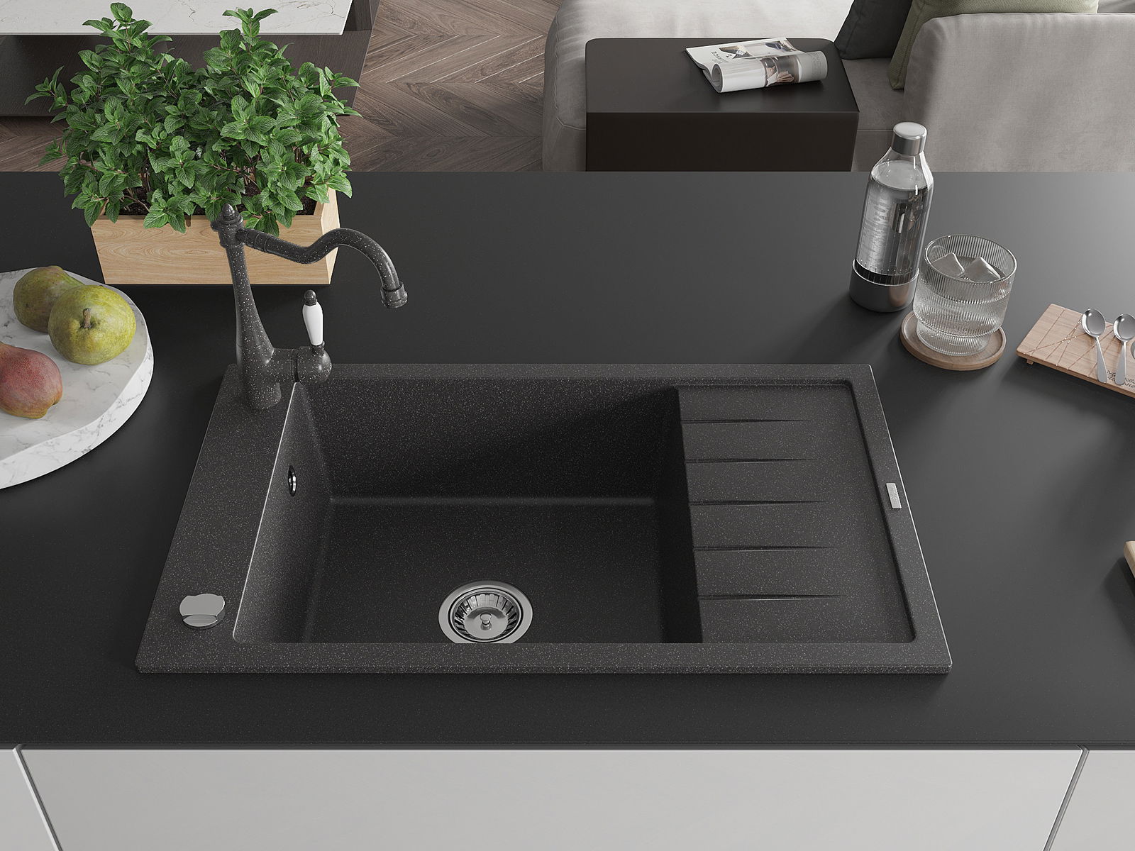 El fregadero está hecho de granito de alta calidad. Constituye un complemento elegante y, sobre todo, práctico para cualquier cocina, independientemente de su estilo. La alta calidad y durabilidad del granito aseguran un uso durante muchos años.