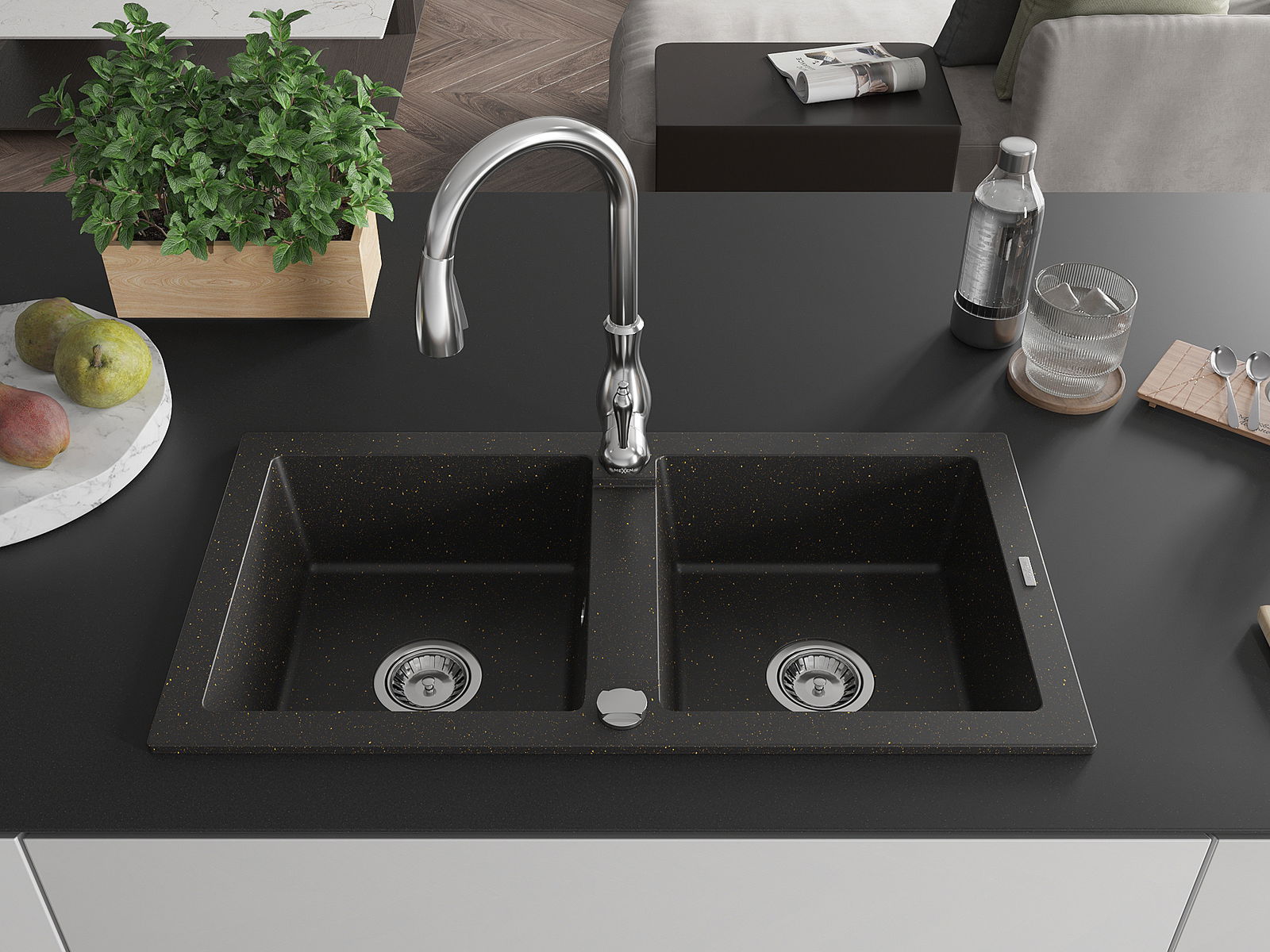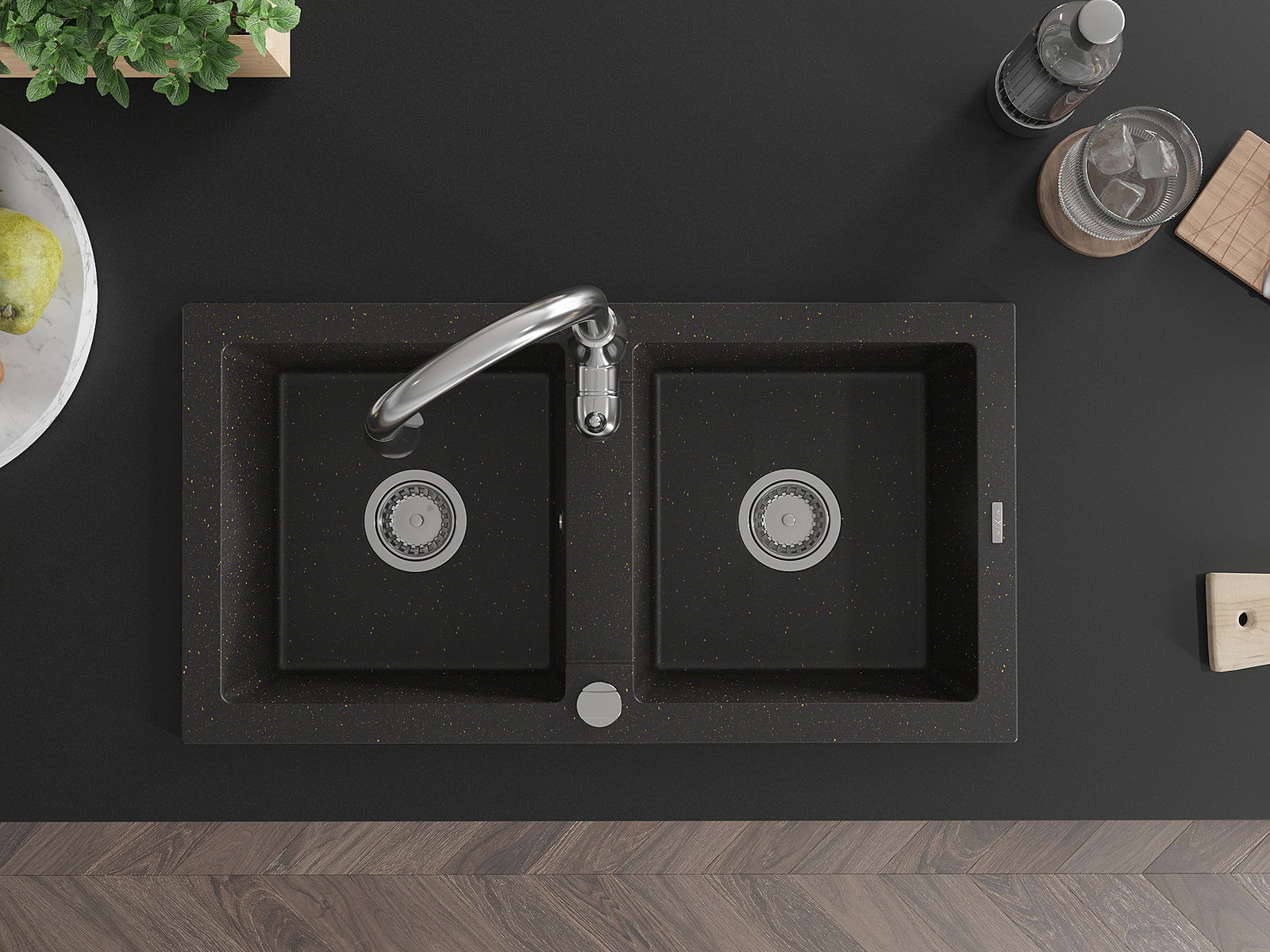 Mexen Mario fregadero de granito de 2 compartimentos con grifo de cocina Savita, negro/dorado metálico - 6504-75-672601-00