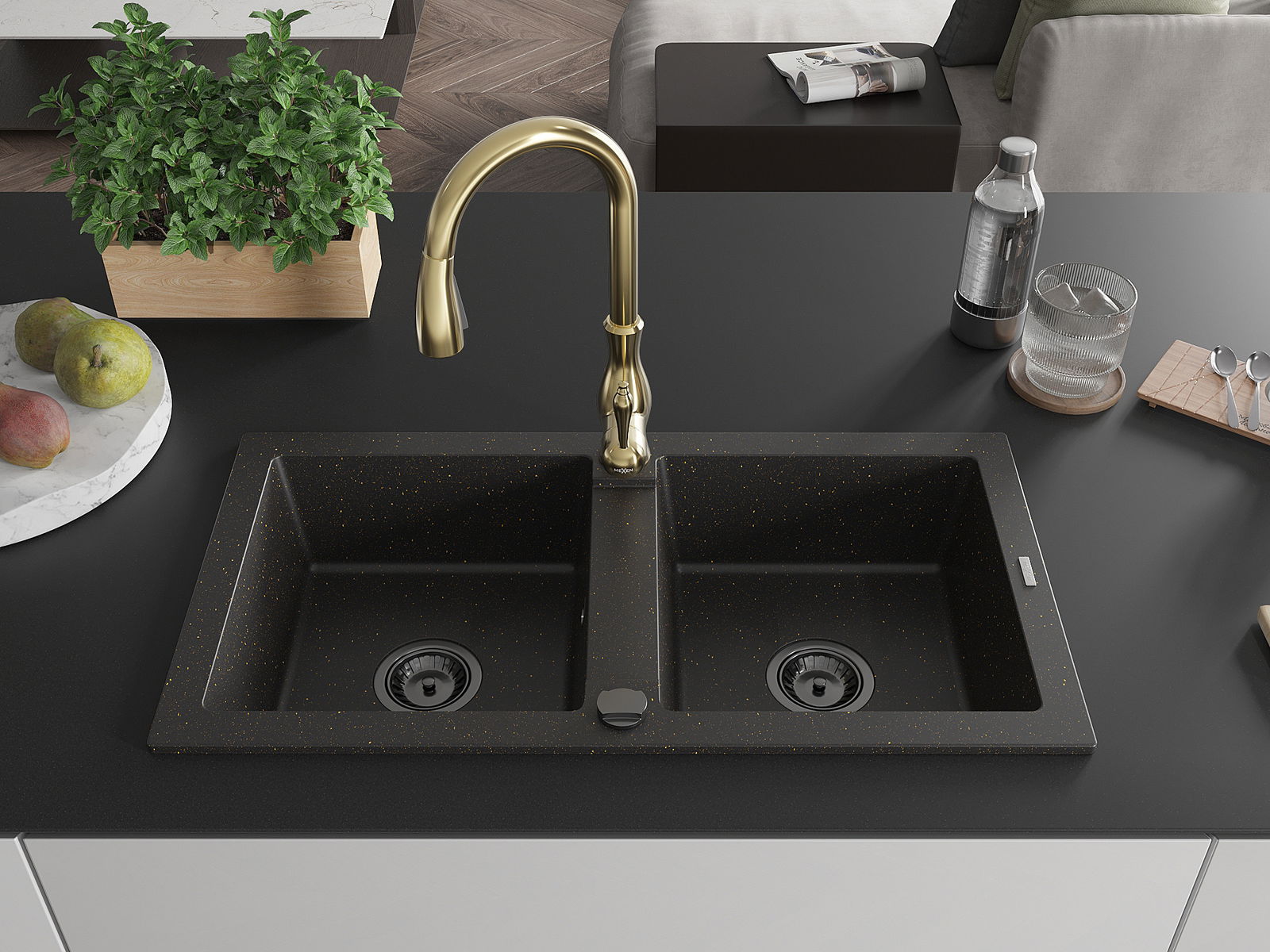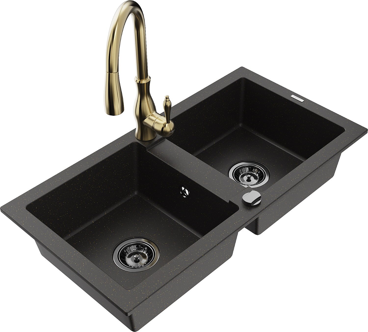 Mexen Mario fregadero de granito de 2 senos con grifo de cocina Savita, negro/dorado metálico - 6504-75-672601-50-B