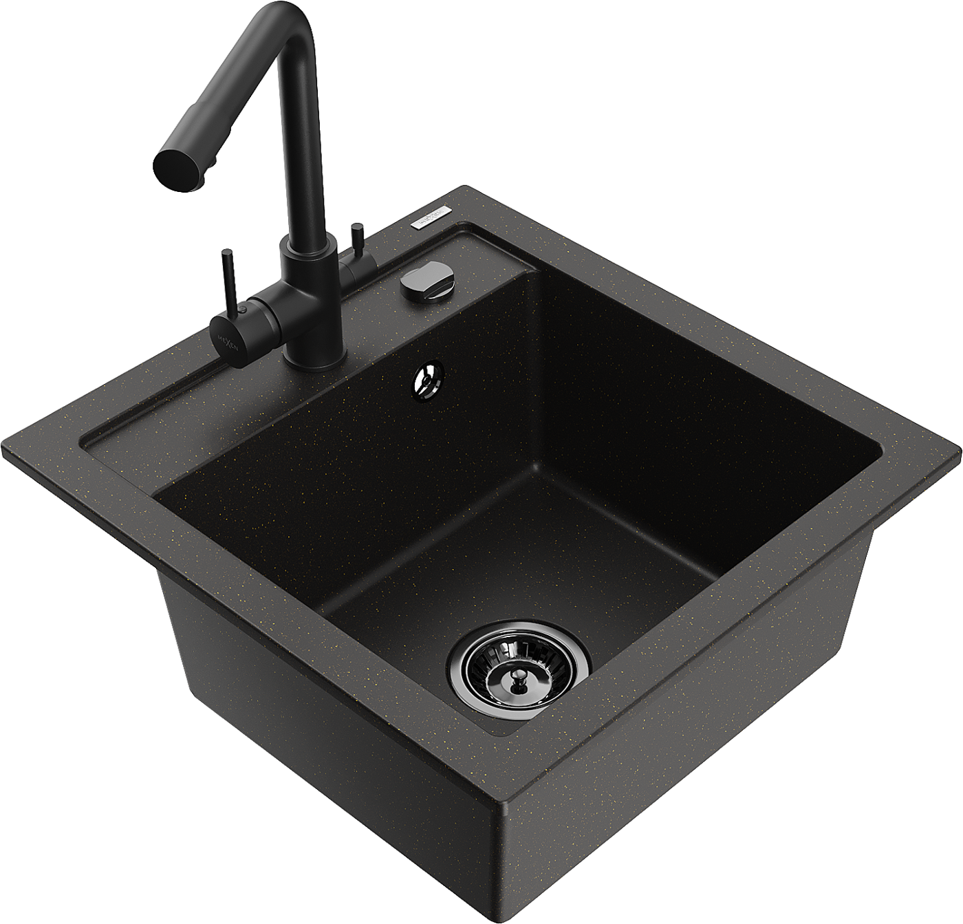 Mexen Vito fregadero de granito de 1 cubeta con grifo de cocina Duero, negro/metálico dorado - 6503-75-671600-70-B