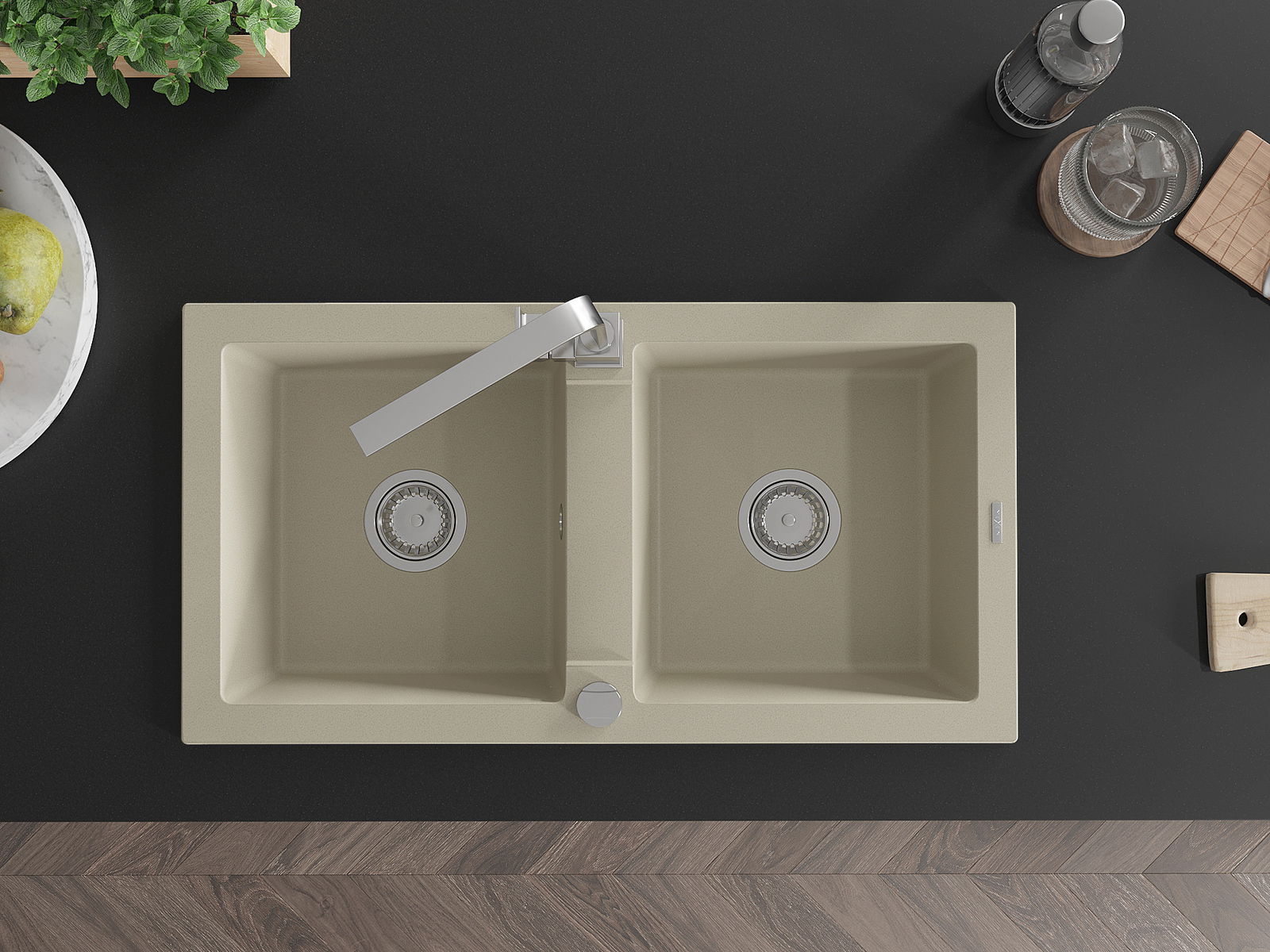 Mexen Mario fregadero de granito de 2 senos con grifo de cocina Rita, beige - 6504-69-670300-00