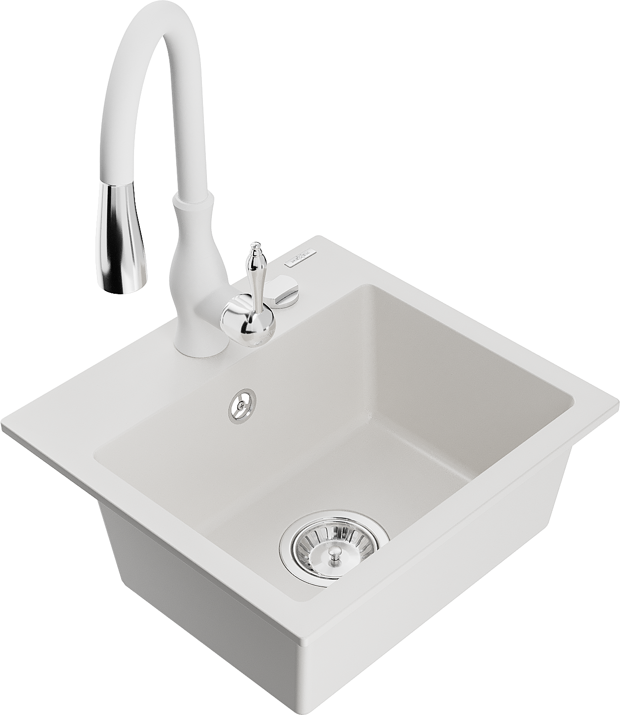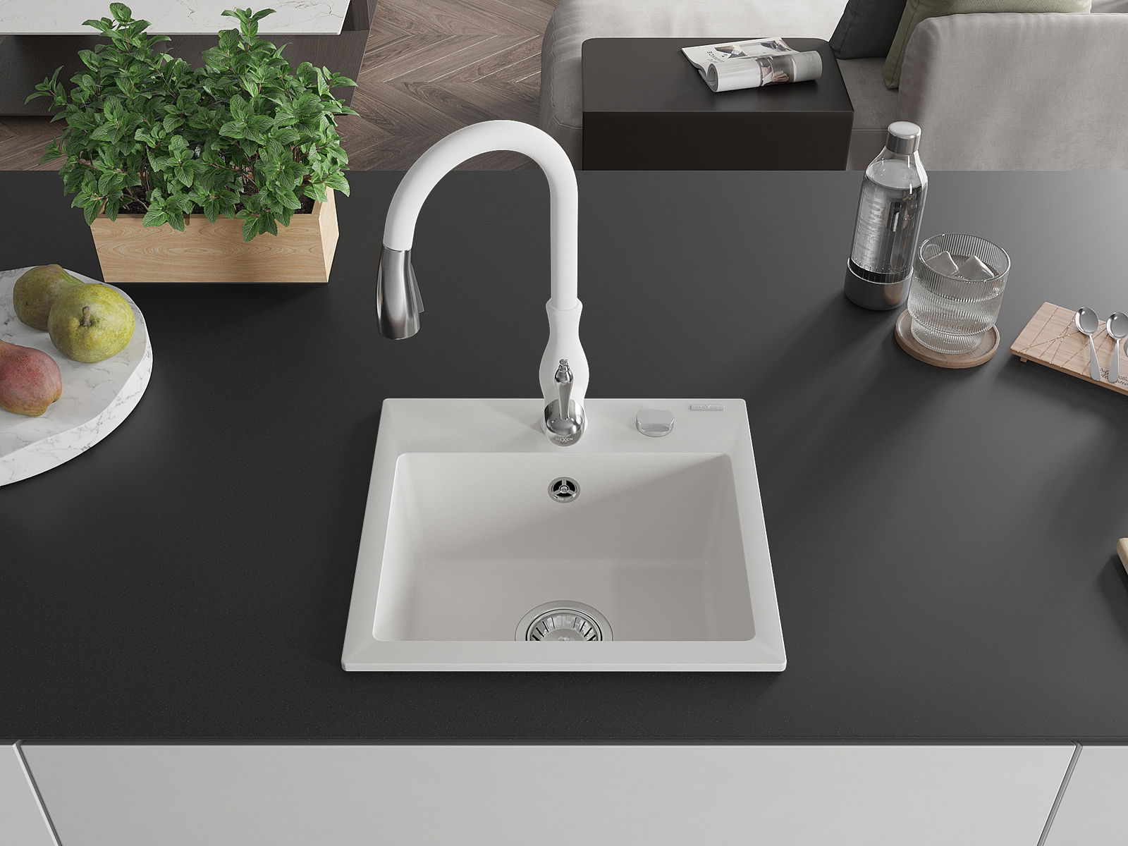 Mexen Milo fregadero de granito de una cubeta con grifo de cocina Savita, blanco - 6505-20-672601-20