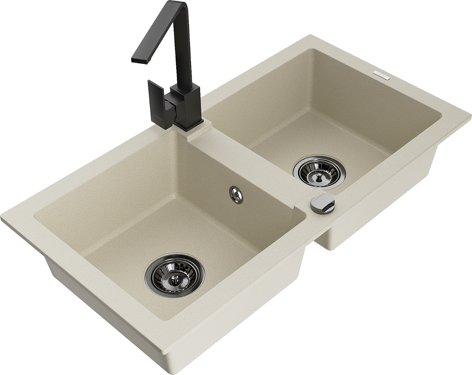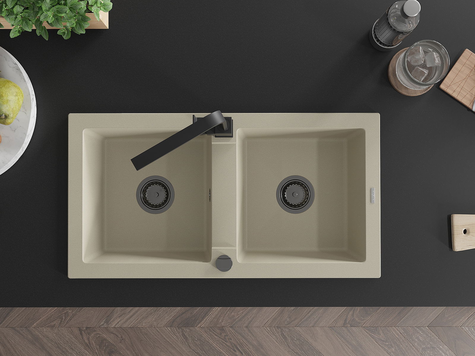 Mexen Mario fregadero de granito de 2 compartimentos con grifo de cocina Rita, beige - 6504-69-670300-70
