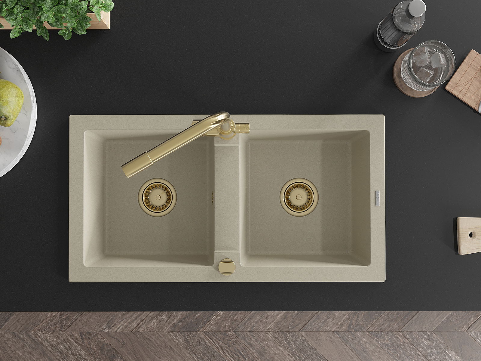 Mexen Mario fregadero de granito de 2 compartimentos con grifo de cocina Duero, beige - 6504-69-671600-50