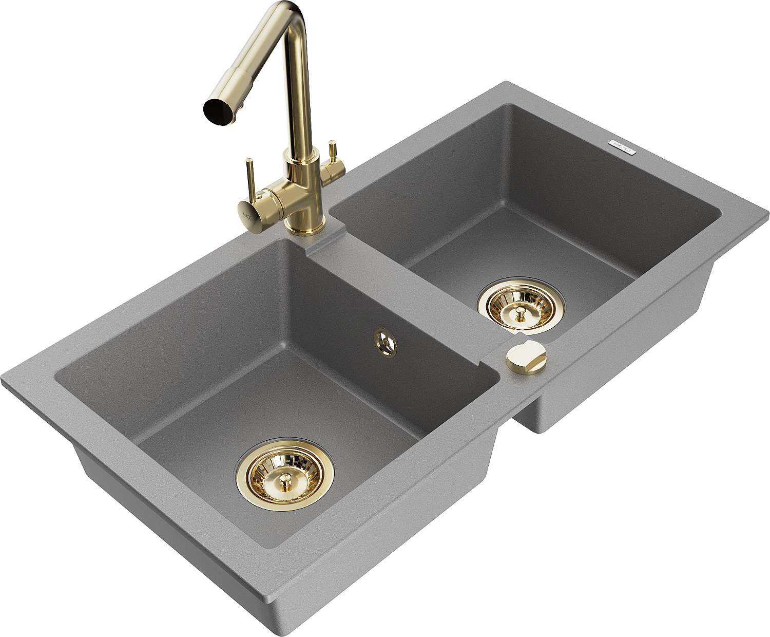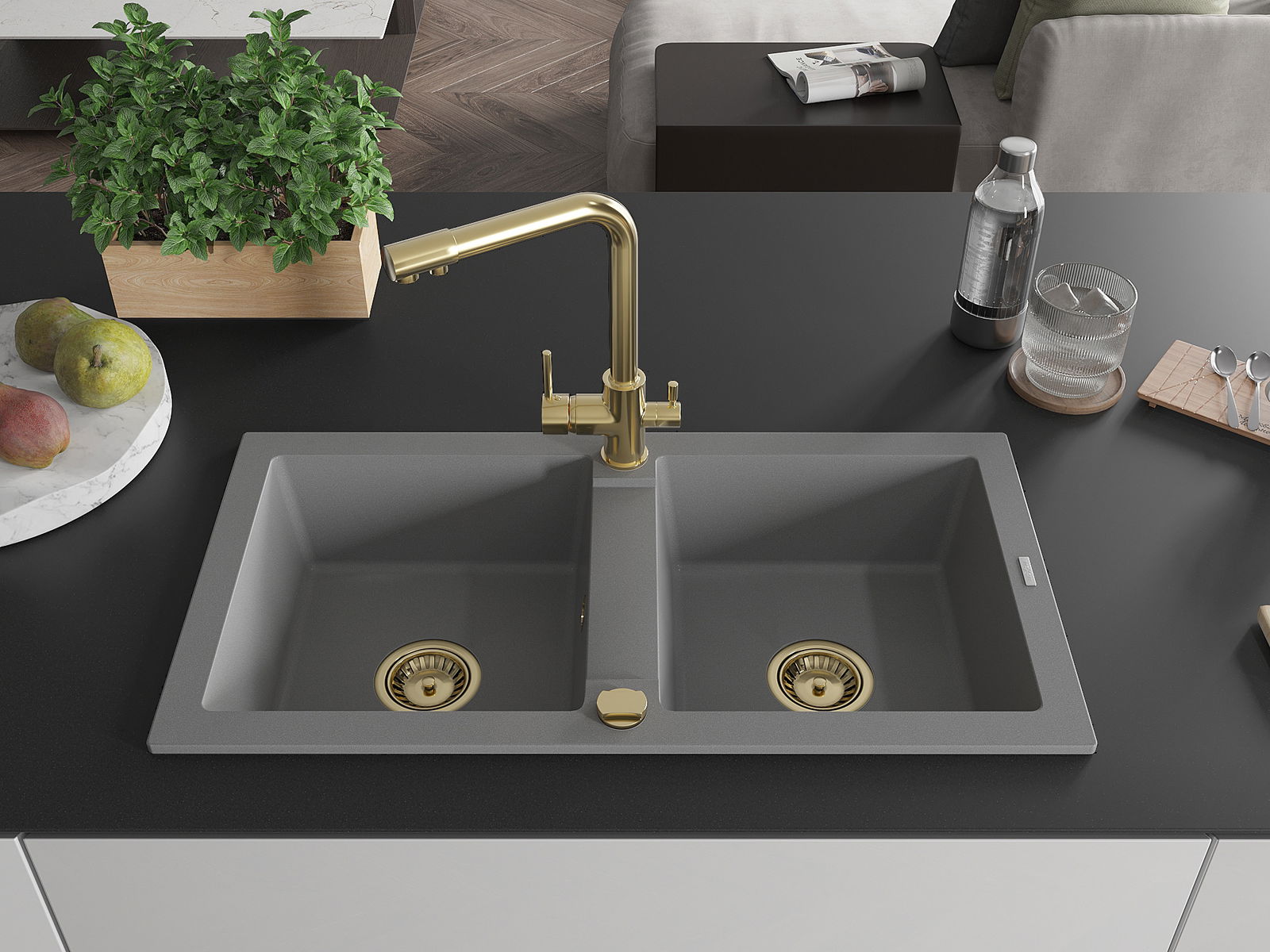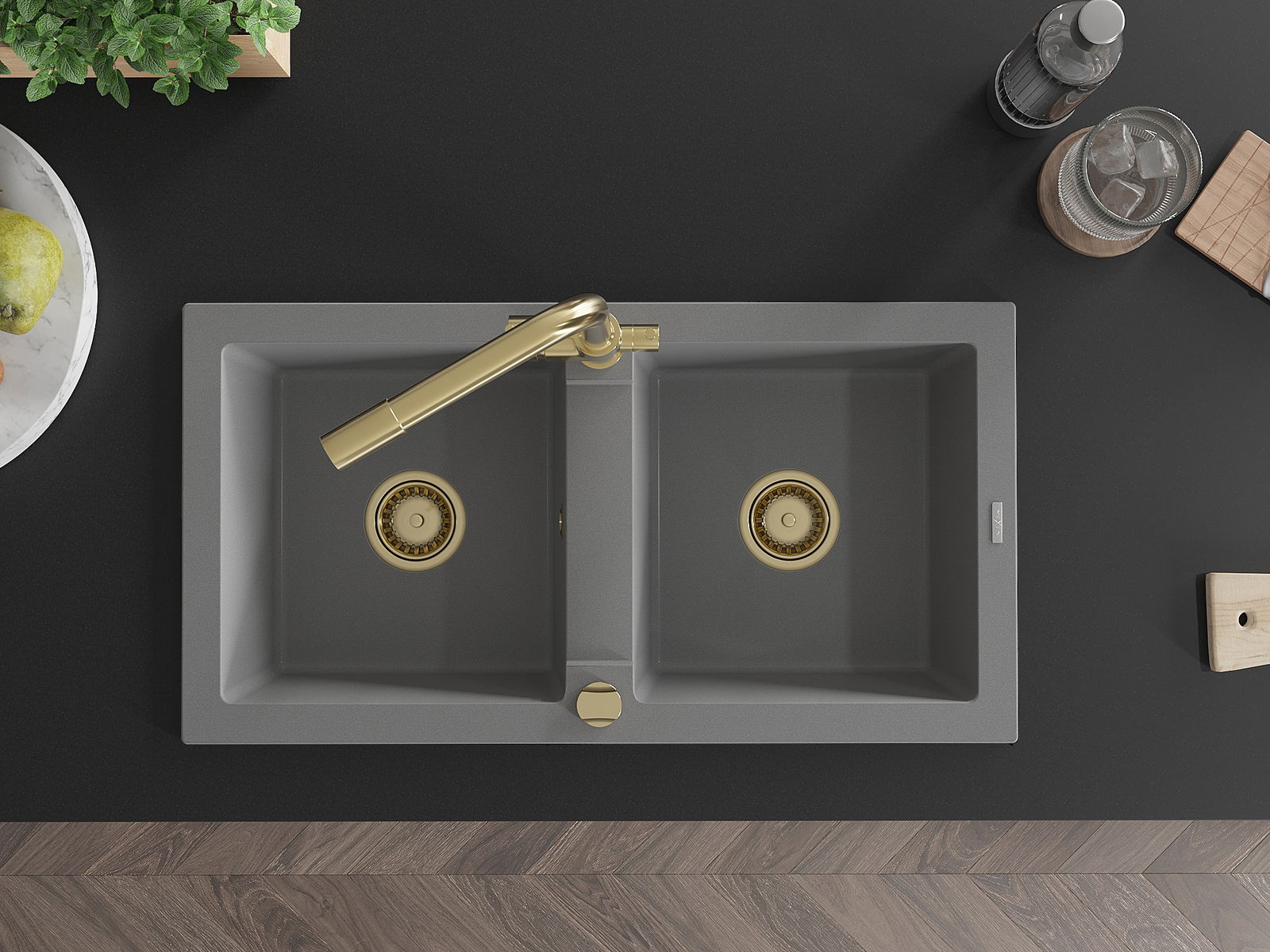 Mexen Mario fregadero de granito de 2 compartimentos con grifo de cocina Duero, gris - 6504-71-671600-50
