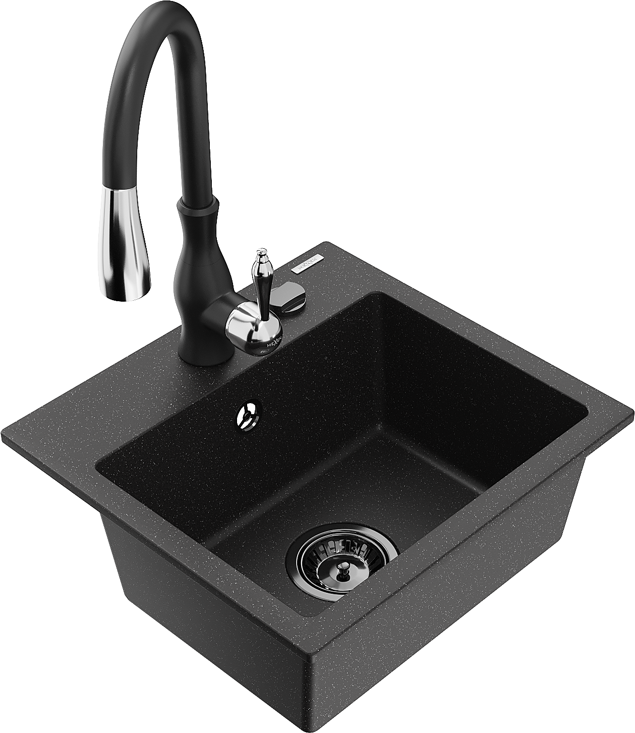 Mexen Milo fregadero de granito de 1 cubeta con grifo de cocina Savita, negro/metálico plateado- 6505-73-672601-70-B