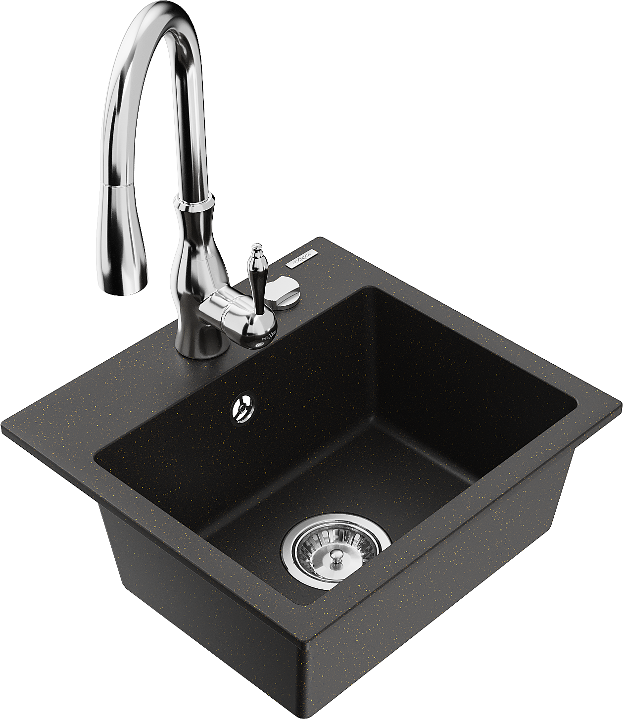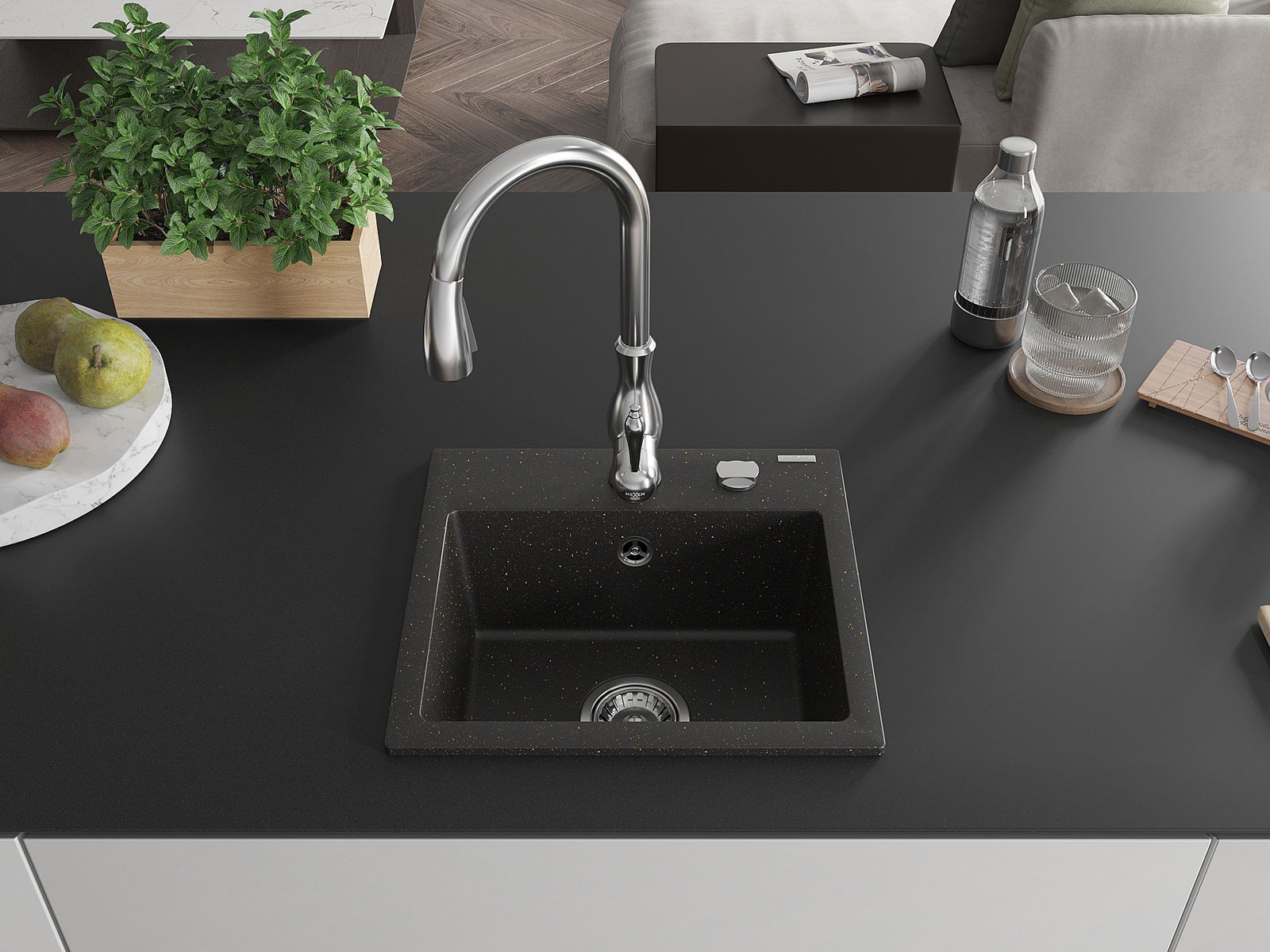 Mexen Milo fregadero de granito de 1 seno con grifo de cocina Savita, negro/dorado metálico- 6505-75-672601-00