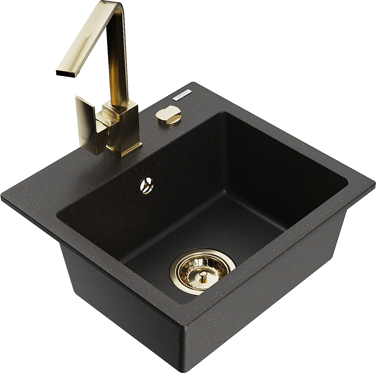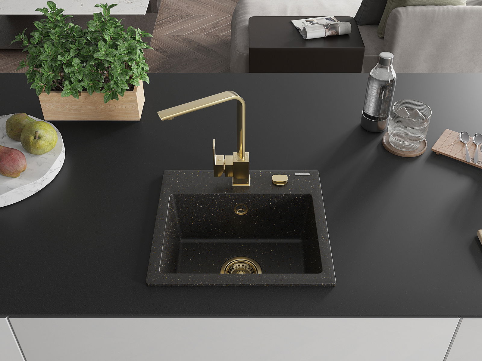 Mexen Milo fregadero de granito de 1 cubeta con grifo de cocina Rita, negro/oro metálico - 6505-75-670300-50