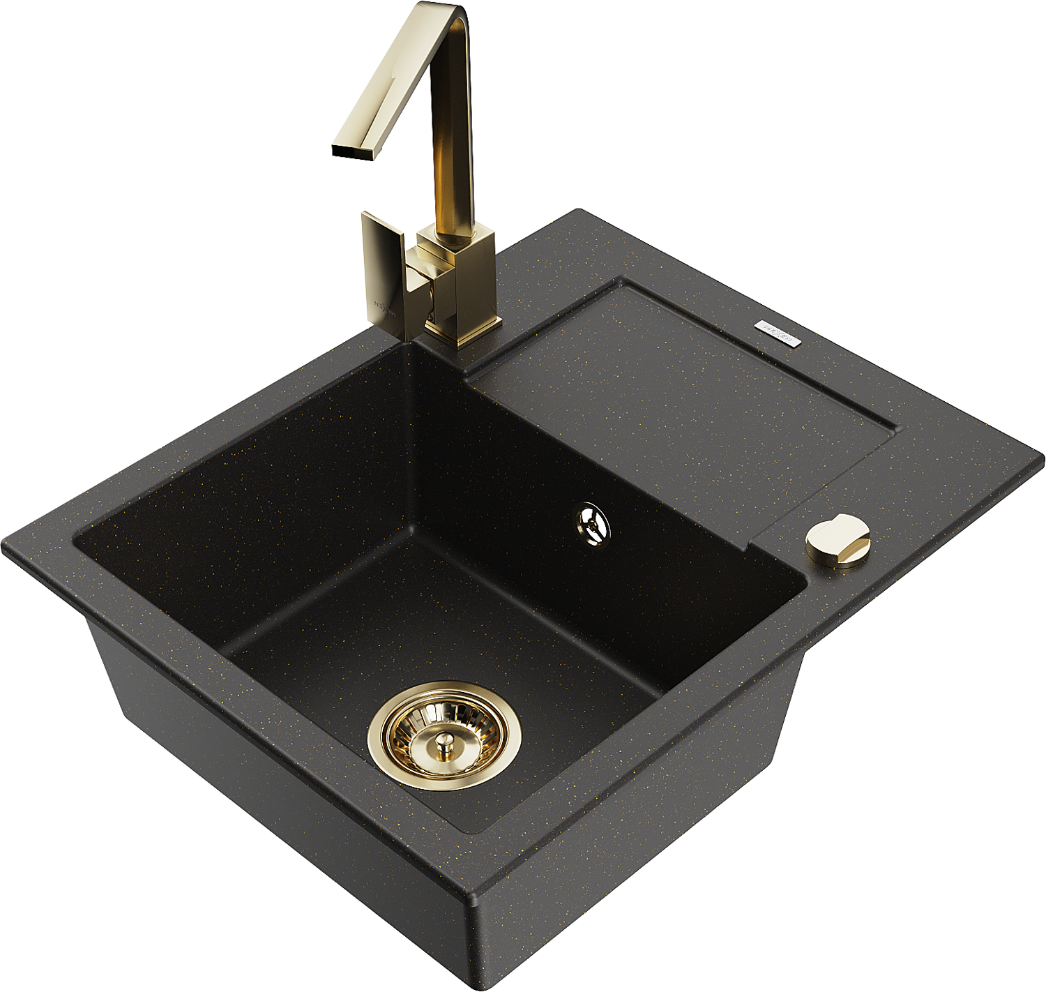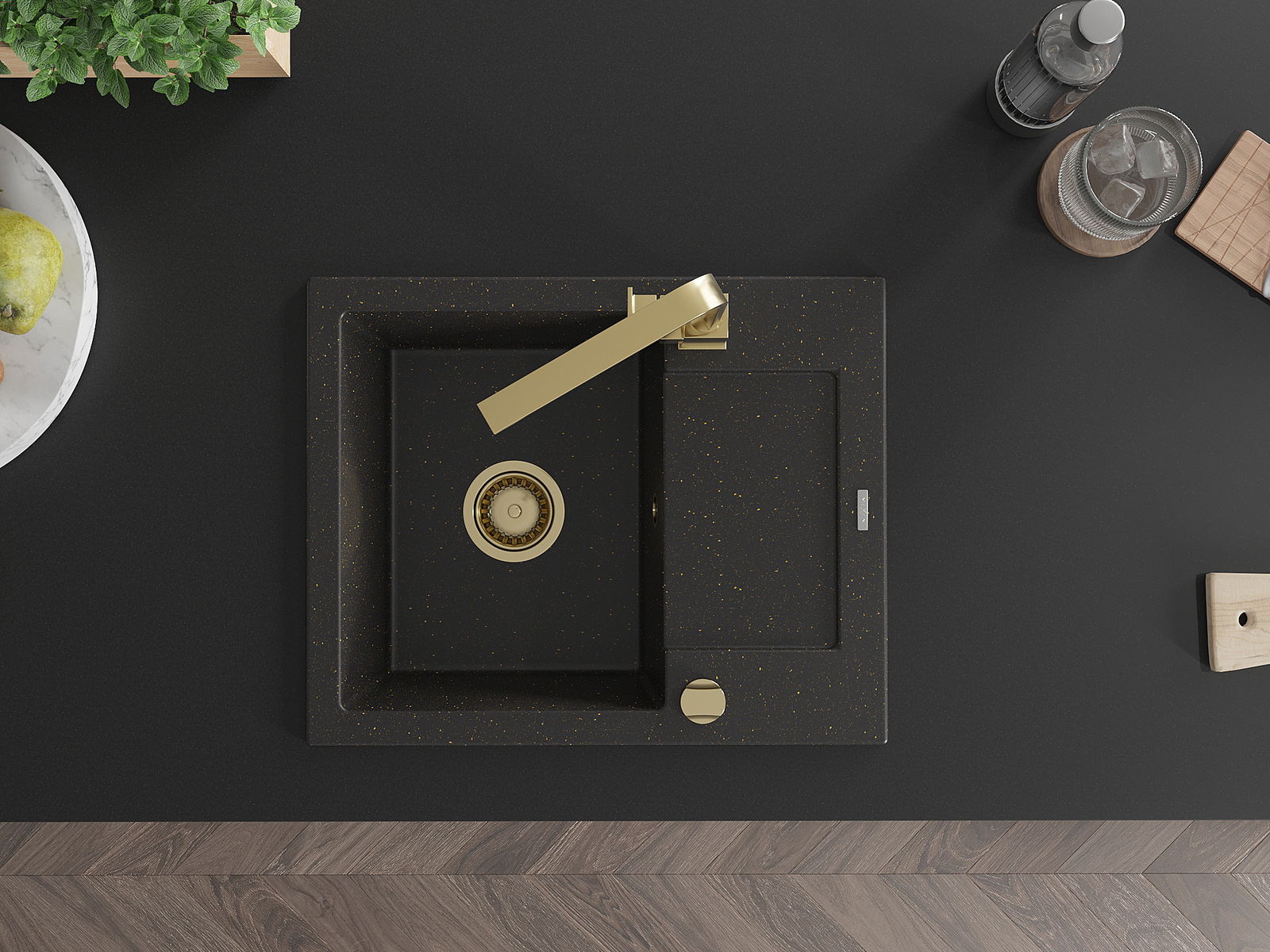 Mexen Enzo fregadero de granito de 1 cubeta con escurridor y grifo de cocina Rita, negro/oro metálico - 6506-75-670300-50