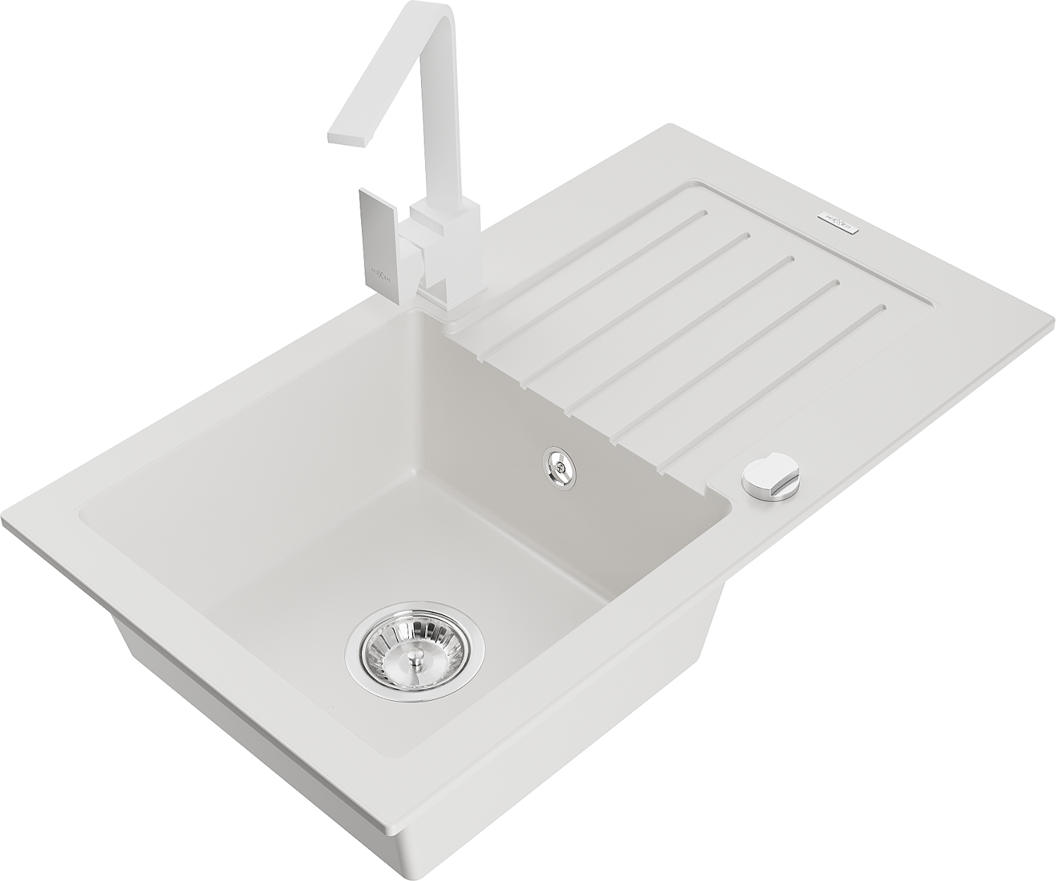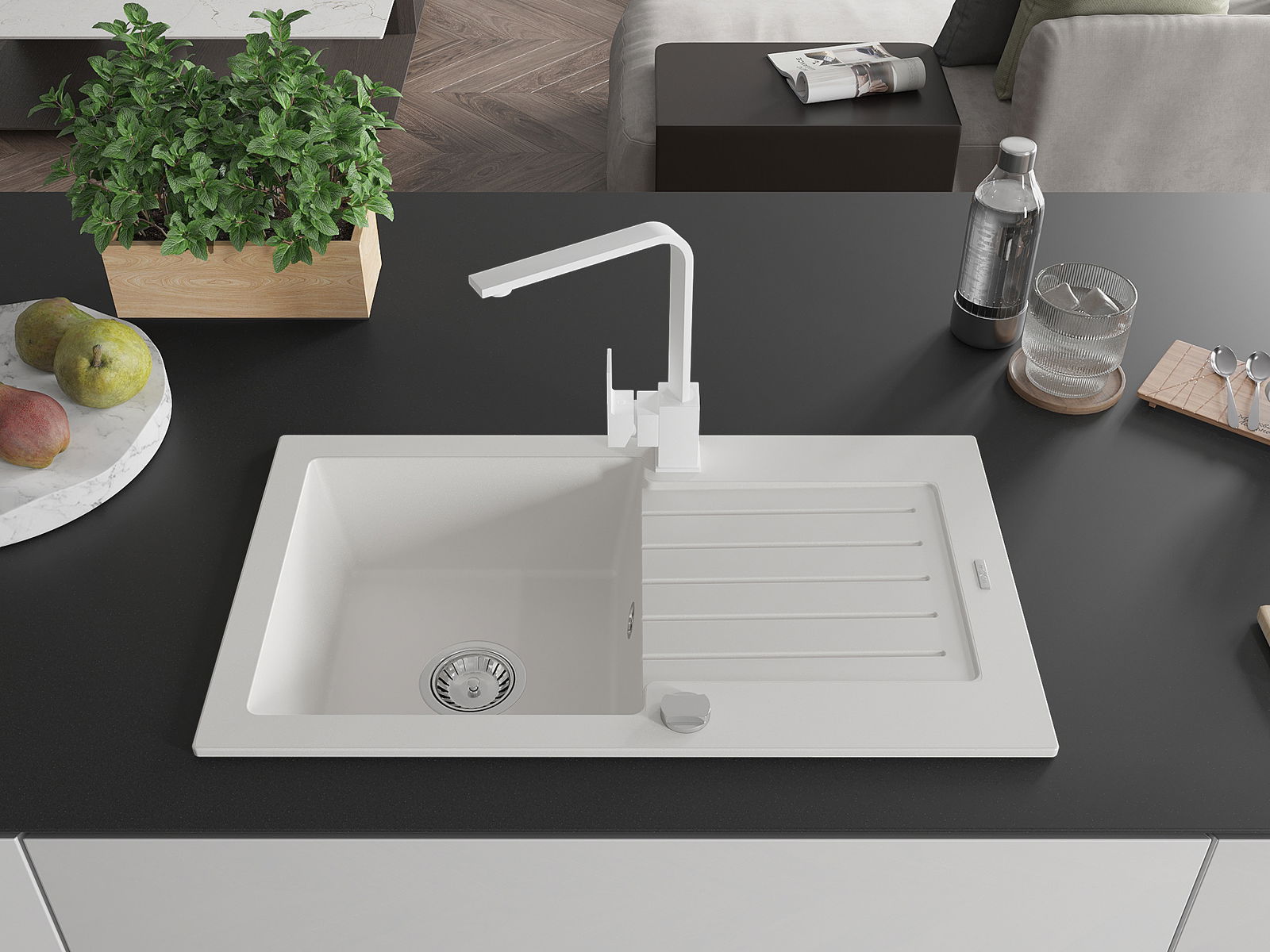 Mexen Pablo fregadero de granito de 1 cubeta con escurridor y grifo de cocina Rita, blanco - 6510-20-670300-20
