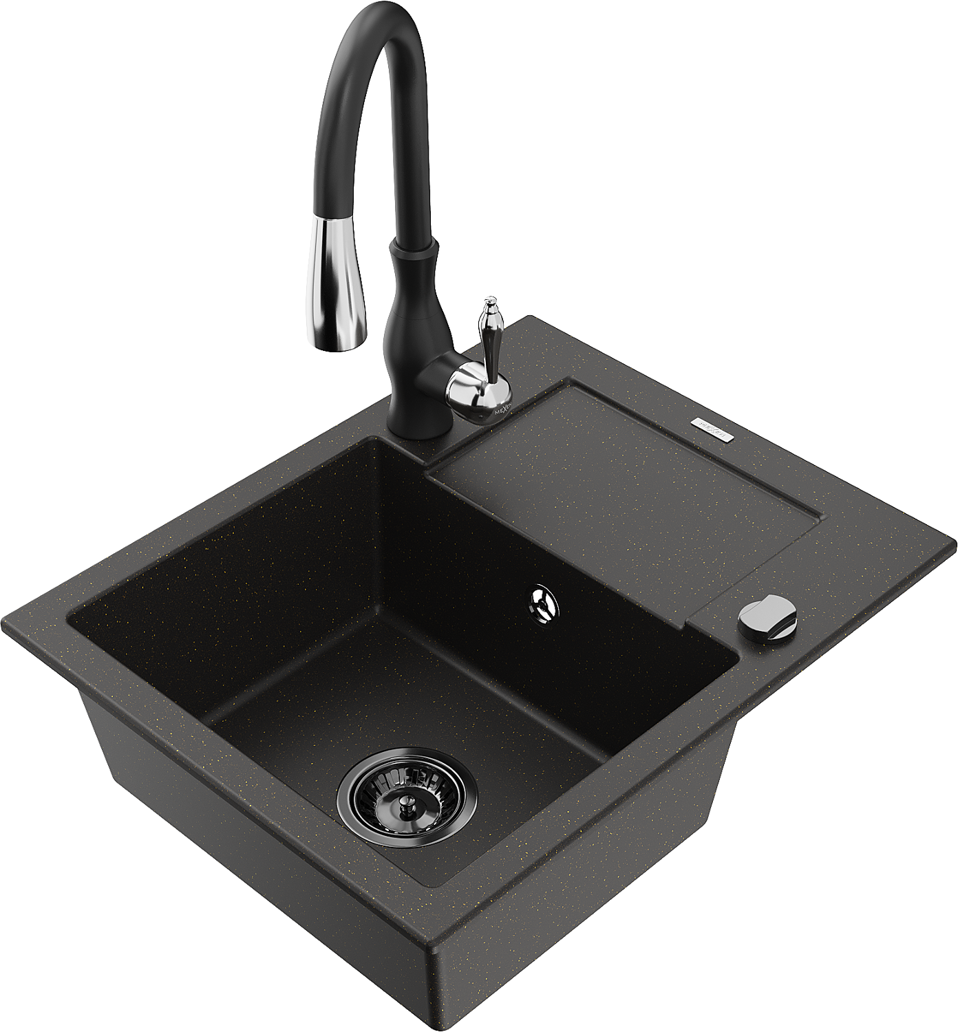 Mexen Enzo fregadero de granito de 1 seno con escurridor y grifo de cocina Savita, negro/metalizado dorado - 6506-75-672601-70-B