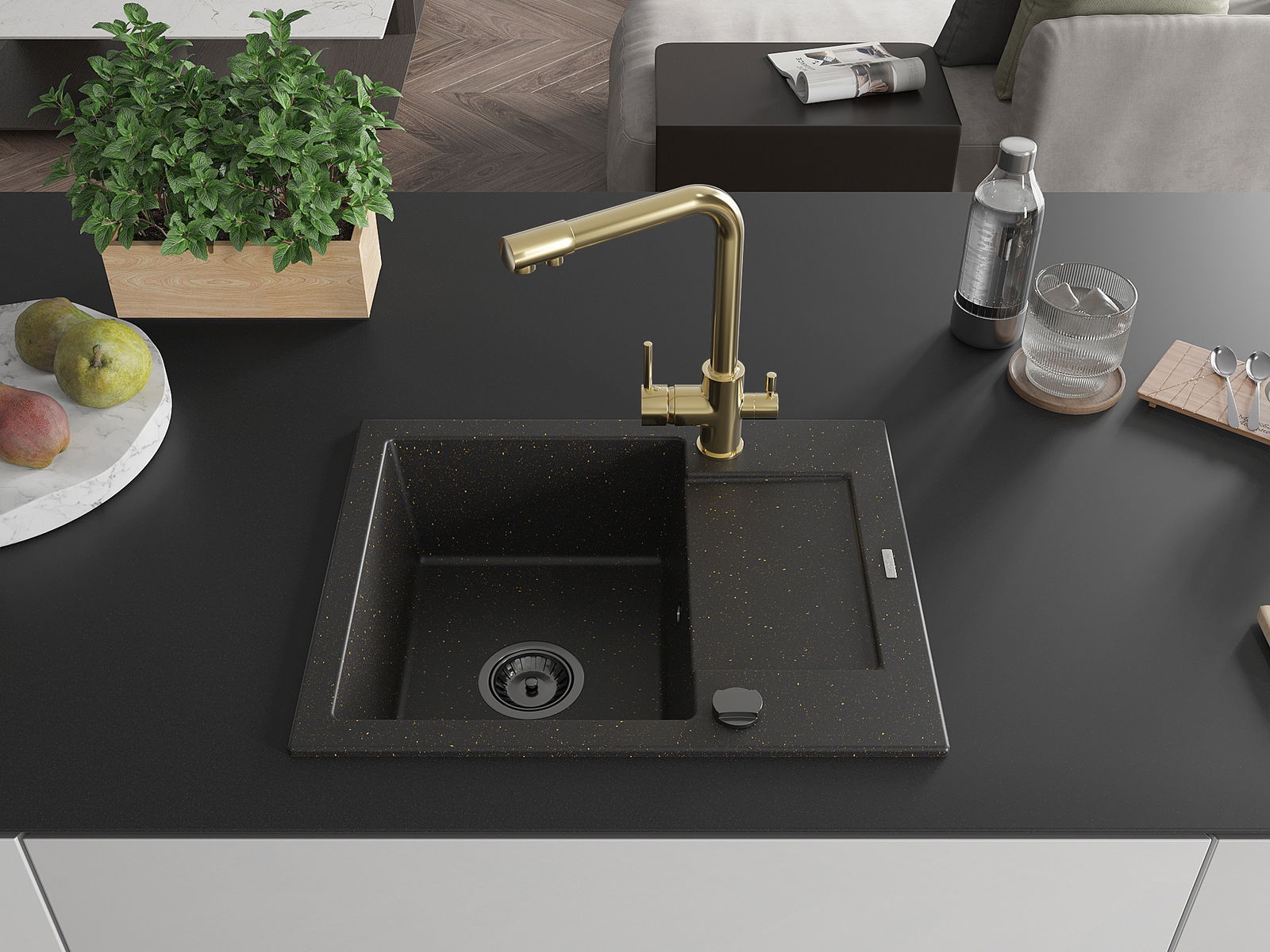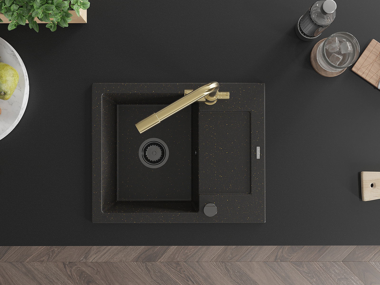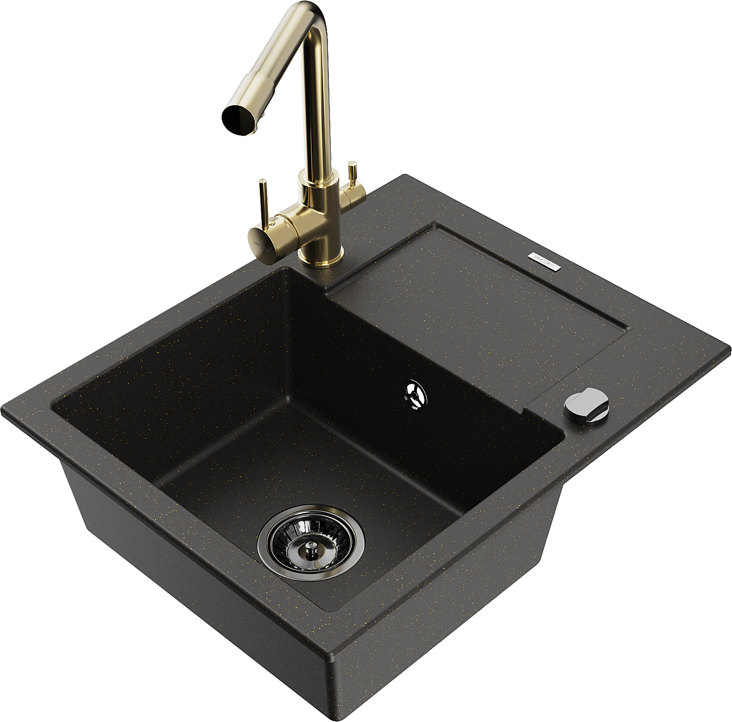 Mexen Enzo fregadero de granito de 1 seno con escurridor y grifo de cocina Duero, negro/dorado metálico - 6506-75-671600-50-B