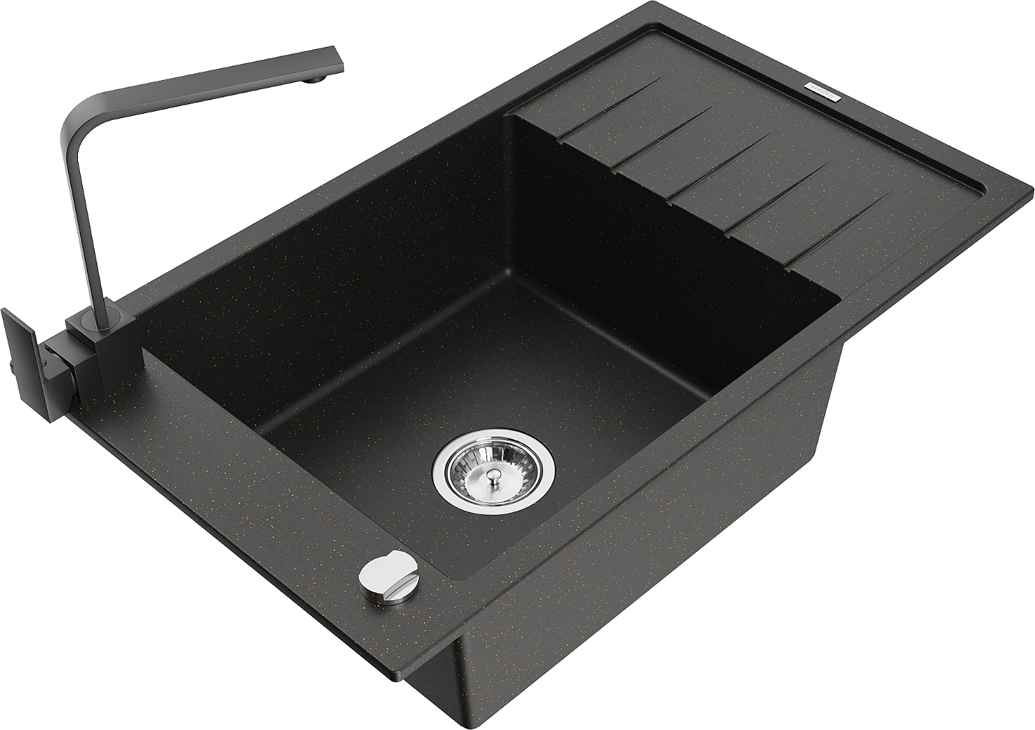 Mexen Elias fregadero de granito de 1 seno con escurridor y grifo de cocina Rita, negro/dorado metálico - 6511-75-670300-70