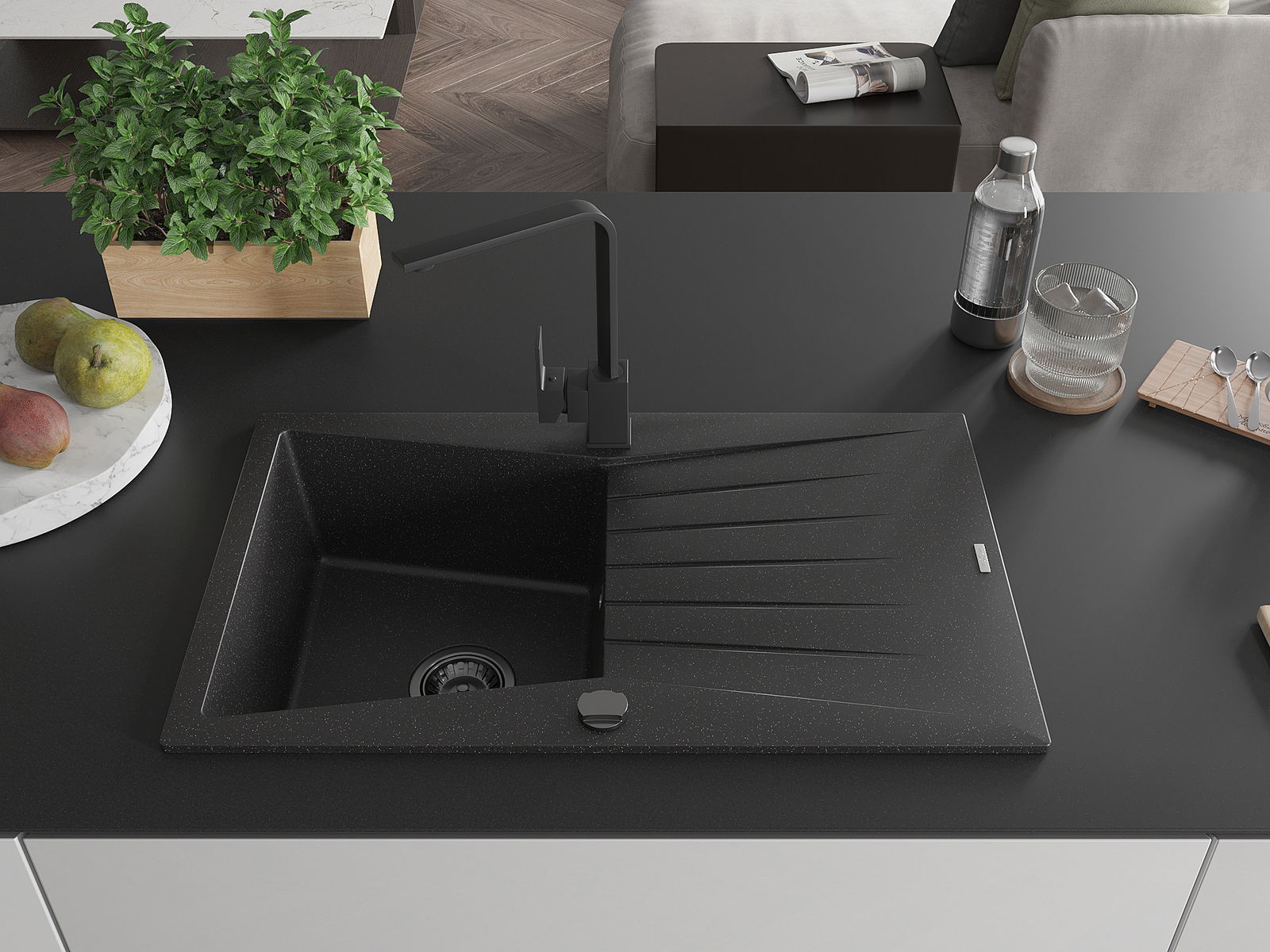 Mexen Cesar fregadero de granito de 1 compartimento con escurridor y grifo de cocina Rita, negro/metálico plateado