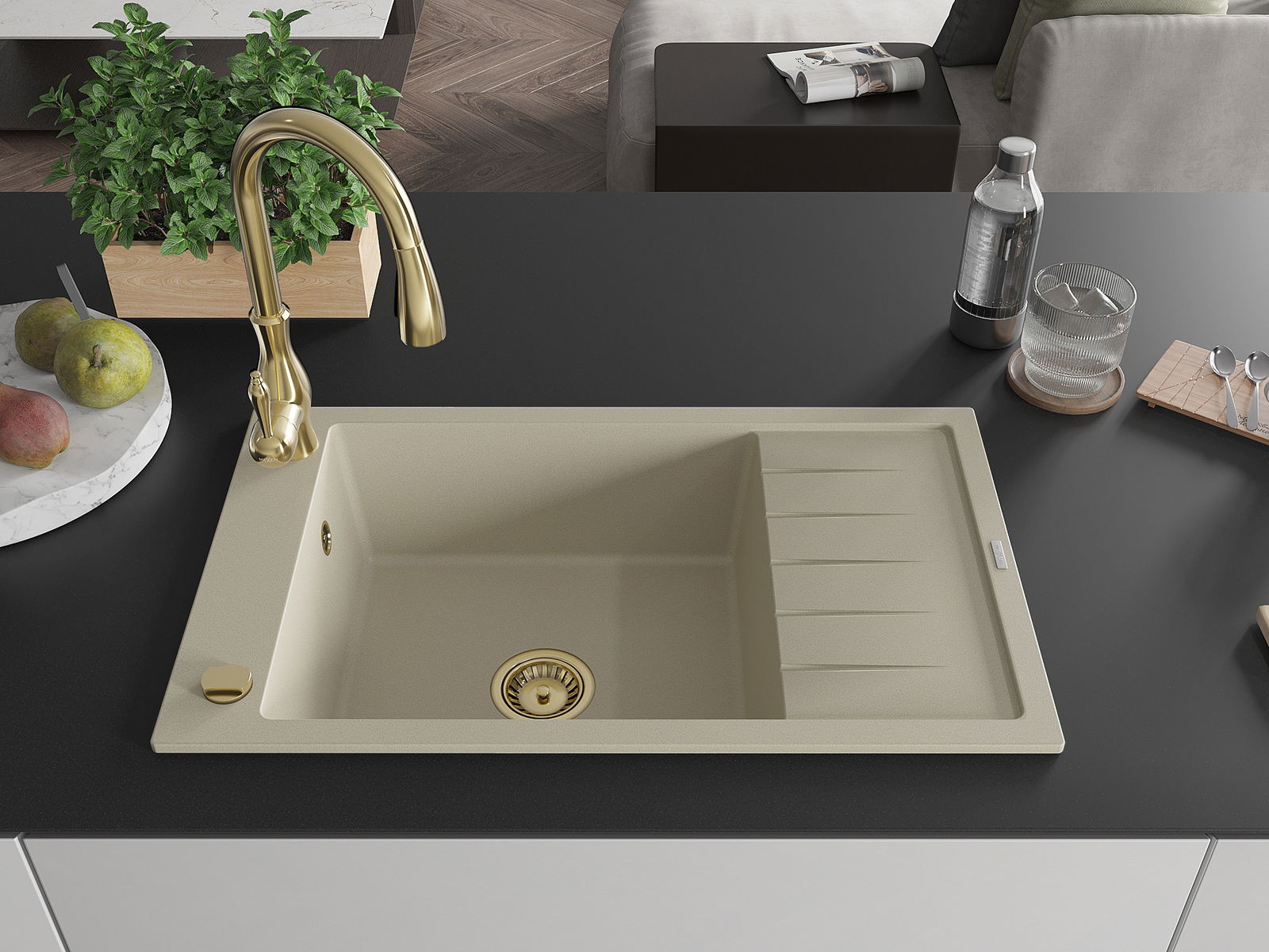 El fregadero está hecho de granito de alta calidad. Constituye un complemento elegante y, sobre todo, práctico para cualquier cocina, independientemente de su estilo. La alta calidad y durabilidad del granito aseguran un uso durante muchos años.