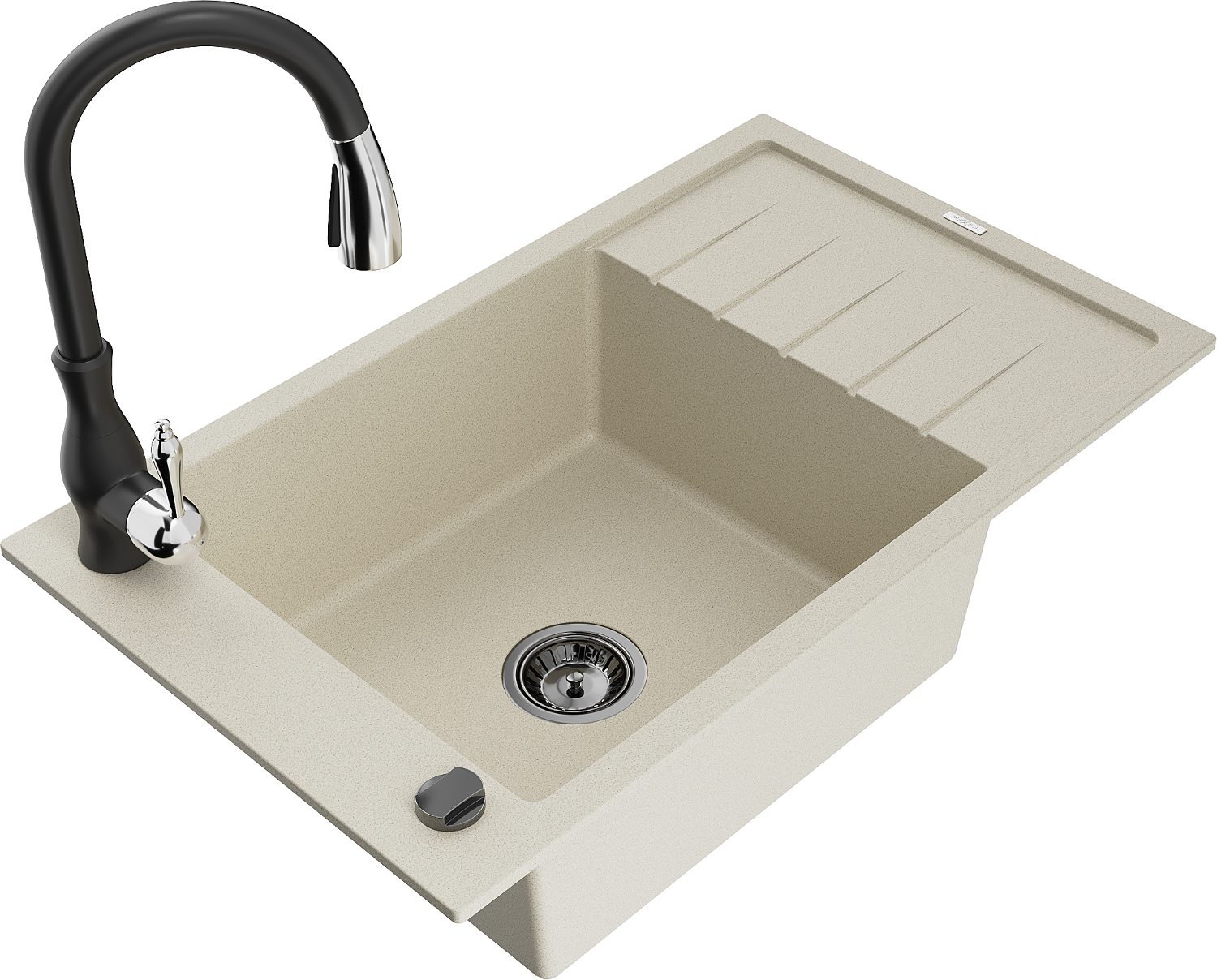 Mexen Elias fregadero de granito de 1 cubeta con escurridor y grifo de cocina Savita, beige - 6511-69-672601-70