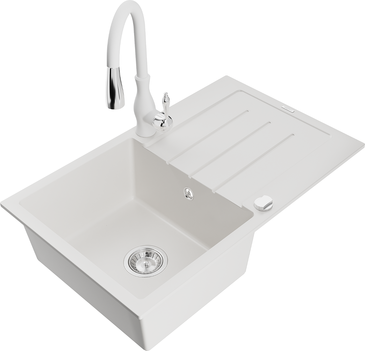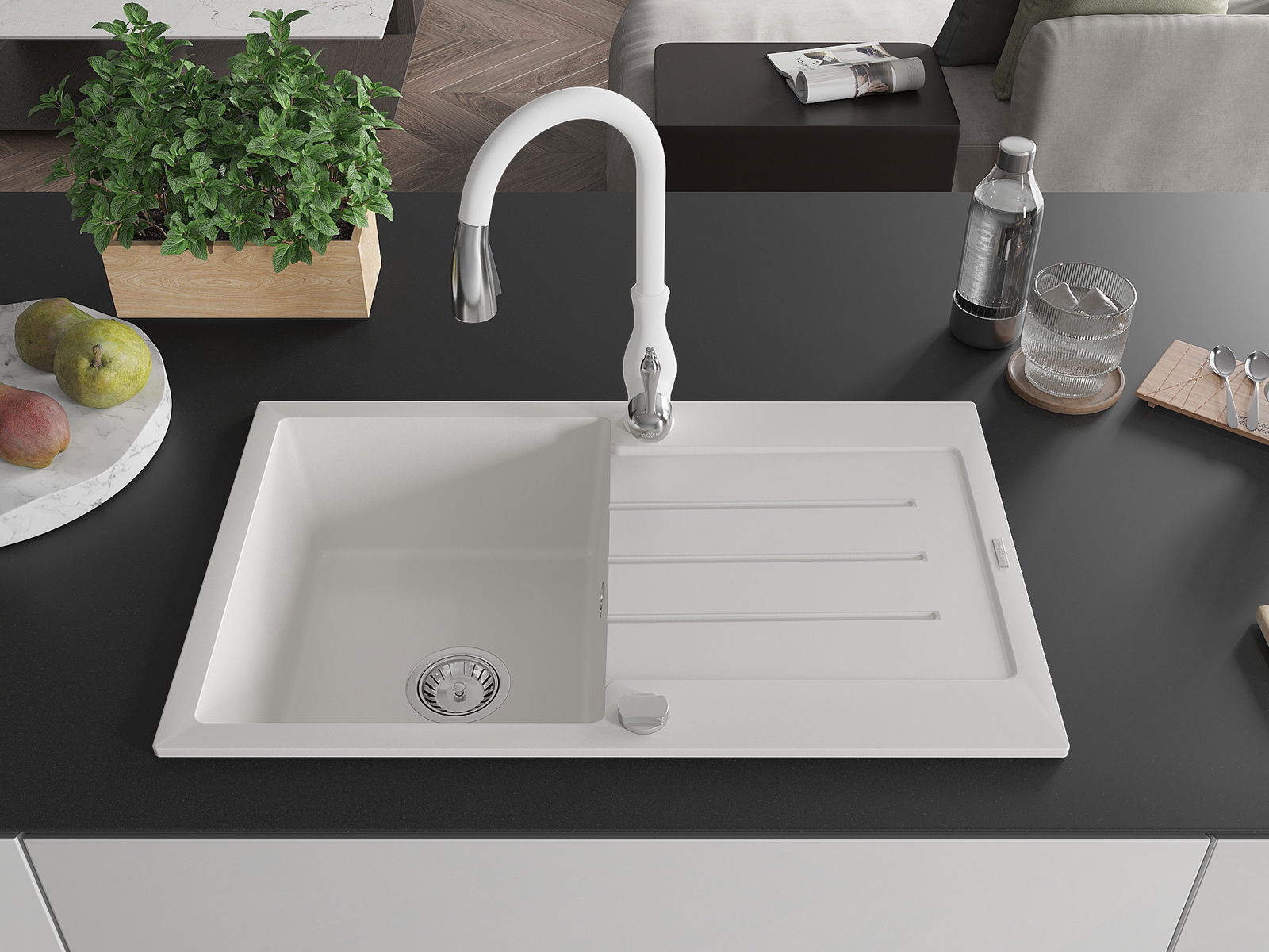 Mexen Bruno fregadero de granito de 1 seno con escurridor y grifo de cocina Savita, blanco - 6513-20-672601-20