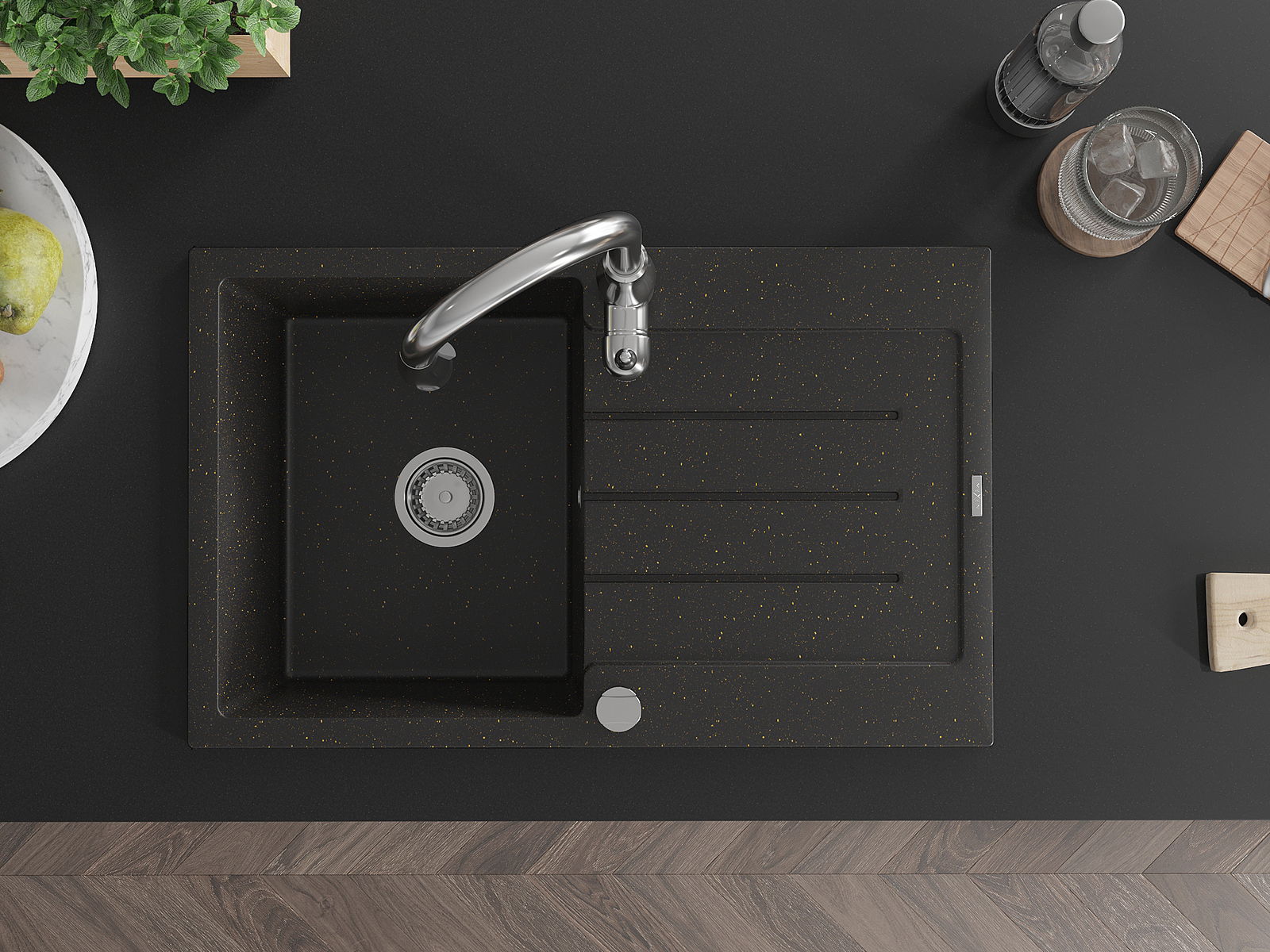 El fregadero está hecho de granito de alta calidad. Constituye un complemento elegante y, sobre todo, práctico para cualquier cocina, independientemente de su estilo. La alta calidad y durabilidad del granito aseguran un uso durante muchos años.
