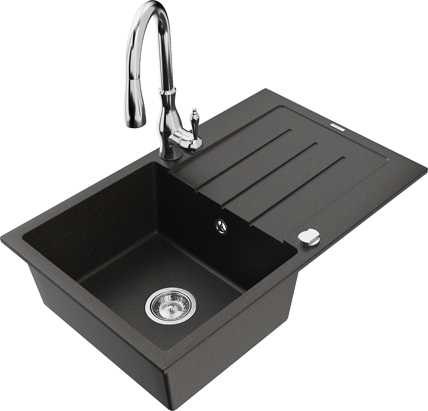 Mexen Bruno fregadero de granito de 1 cubeta con escurridor y grifo de cocina Savita, negro/dorado metálico - 6513-75-672601-00