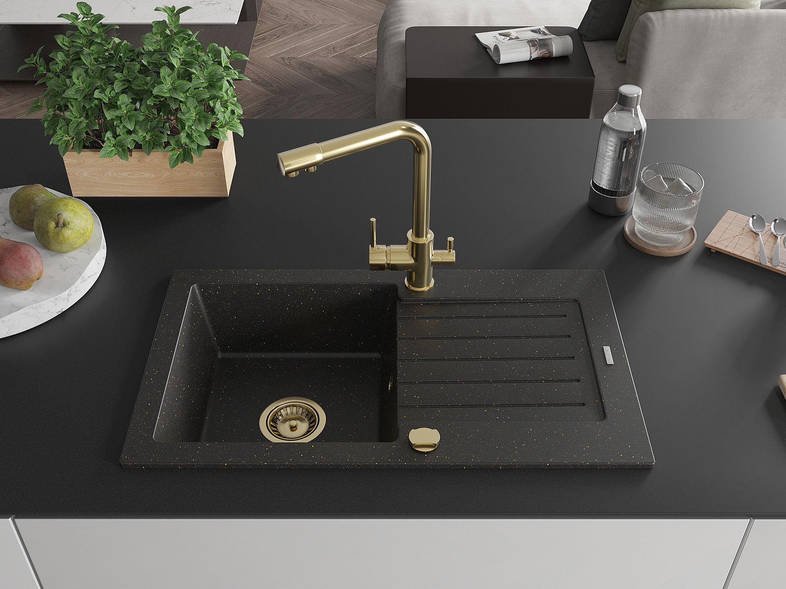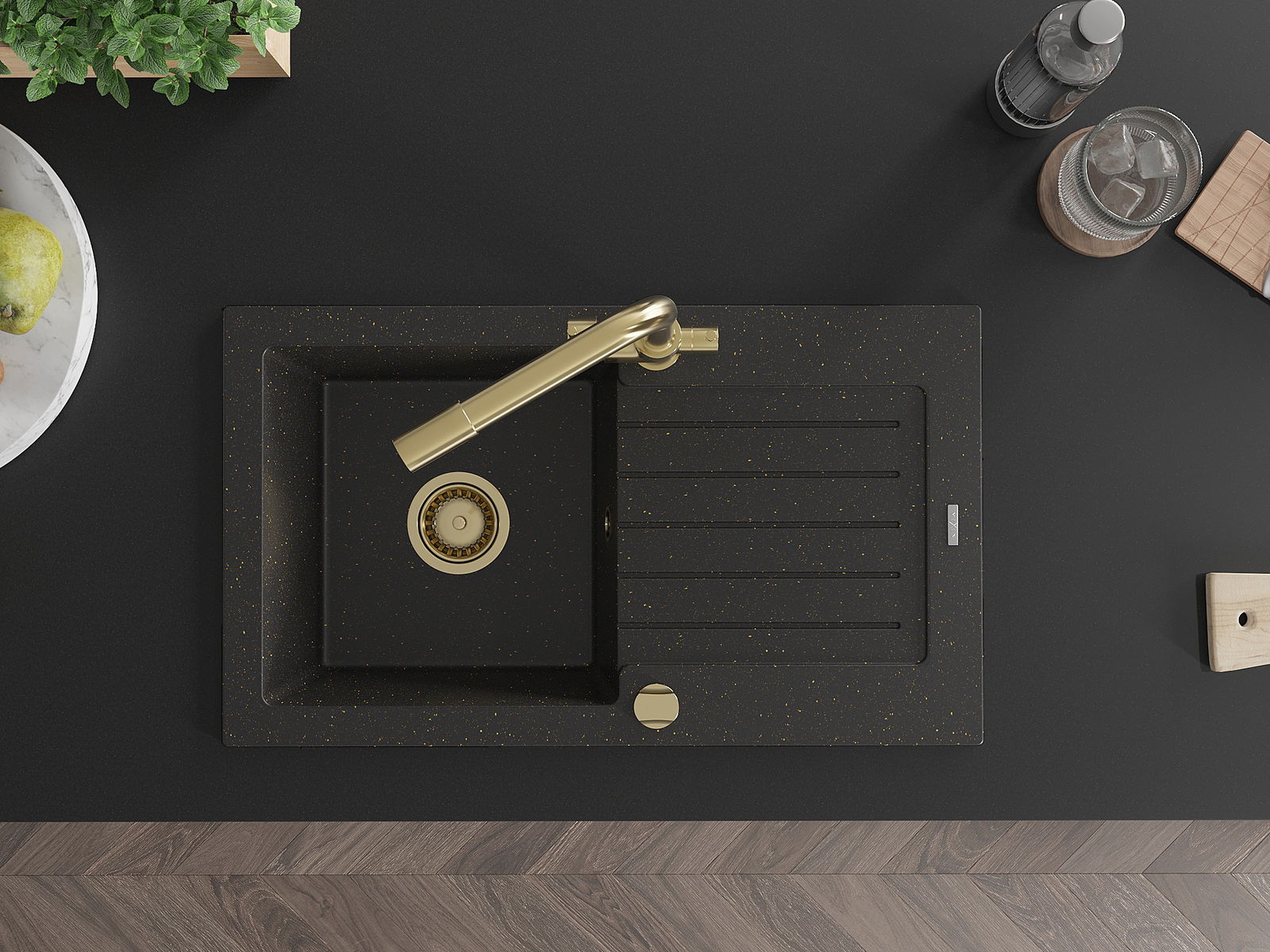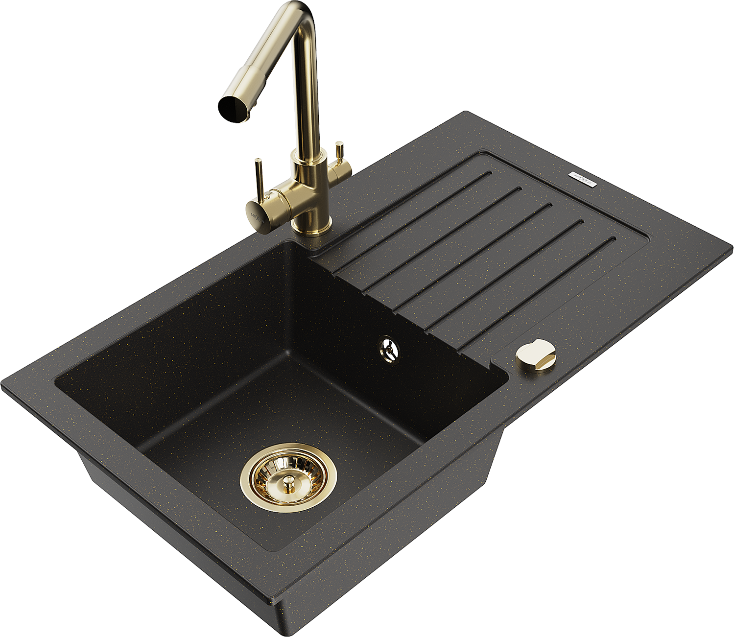 Mexen Pablo fregadero de granito de 1 seno con escurridor y grifo de cocina Duero, negro/dorado metálico - 6510-75-671600-50