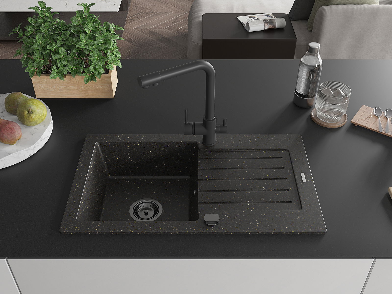 El fregadero está hecho de granito de alta calidad. Constituye un complemento elegante y, sobre todo, práctico para cualquier cocina, independientemente de su estilo. La alta calidad y durabilidad del granito aseguran un uso durante muchos años.