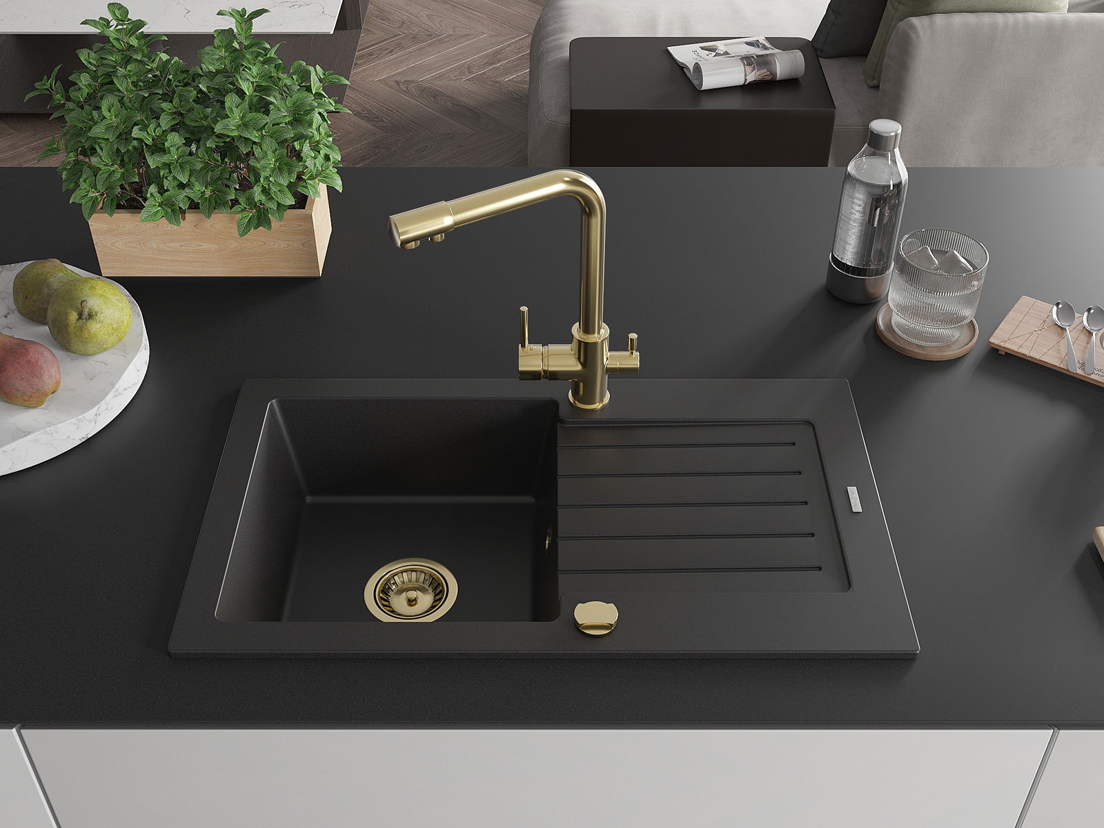 El fregadero está hecho de granito de alta calidad. Constituye un complemento elegante y, sobre todo, práctico para cualquier cocina, independientemente de su estilo. La alta calidad y durabilidad del granito aseguran un uso durante muchos años.