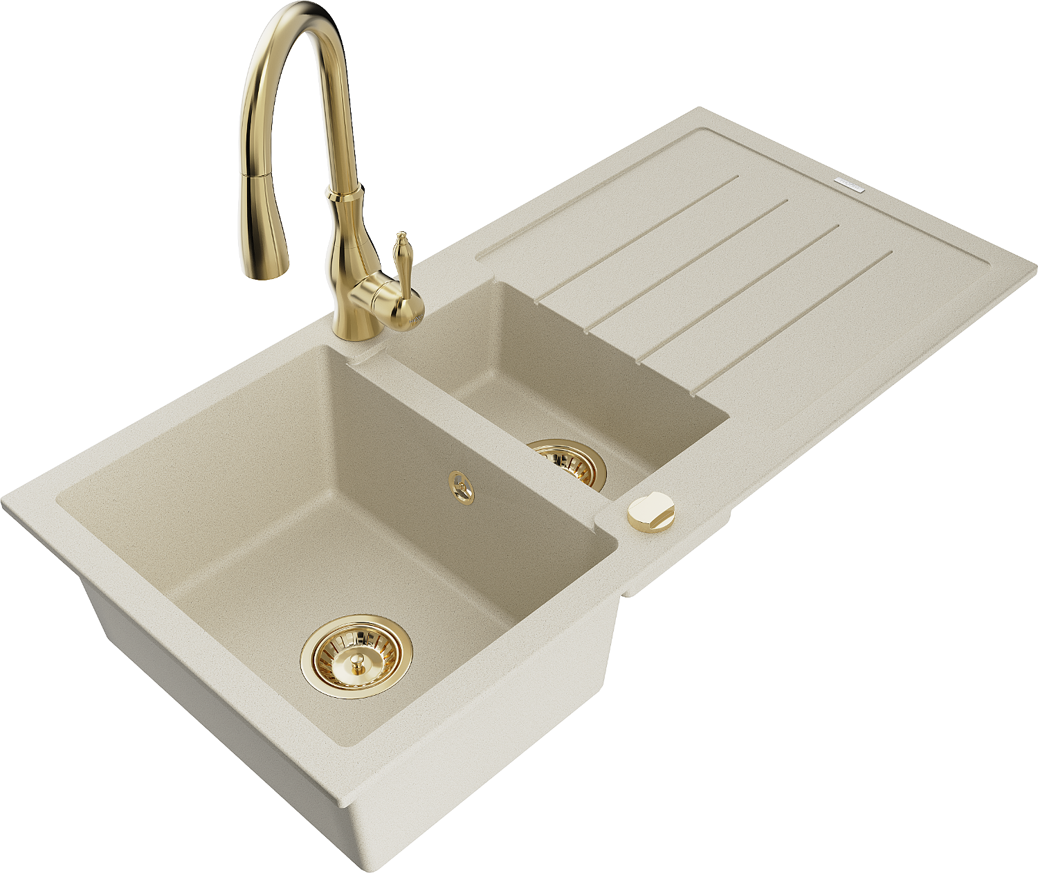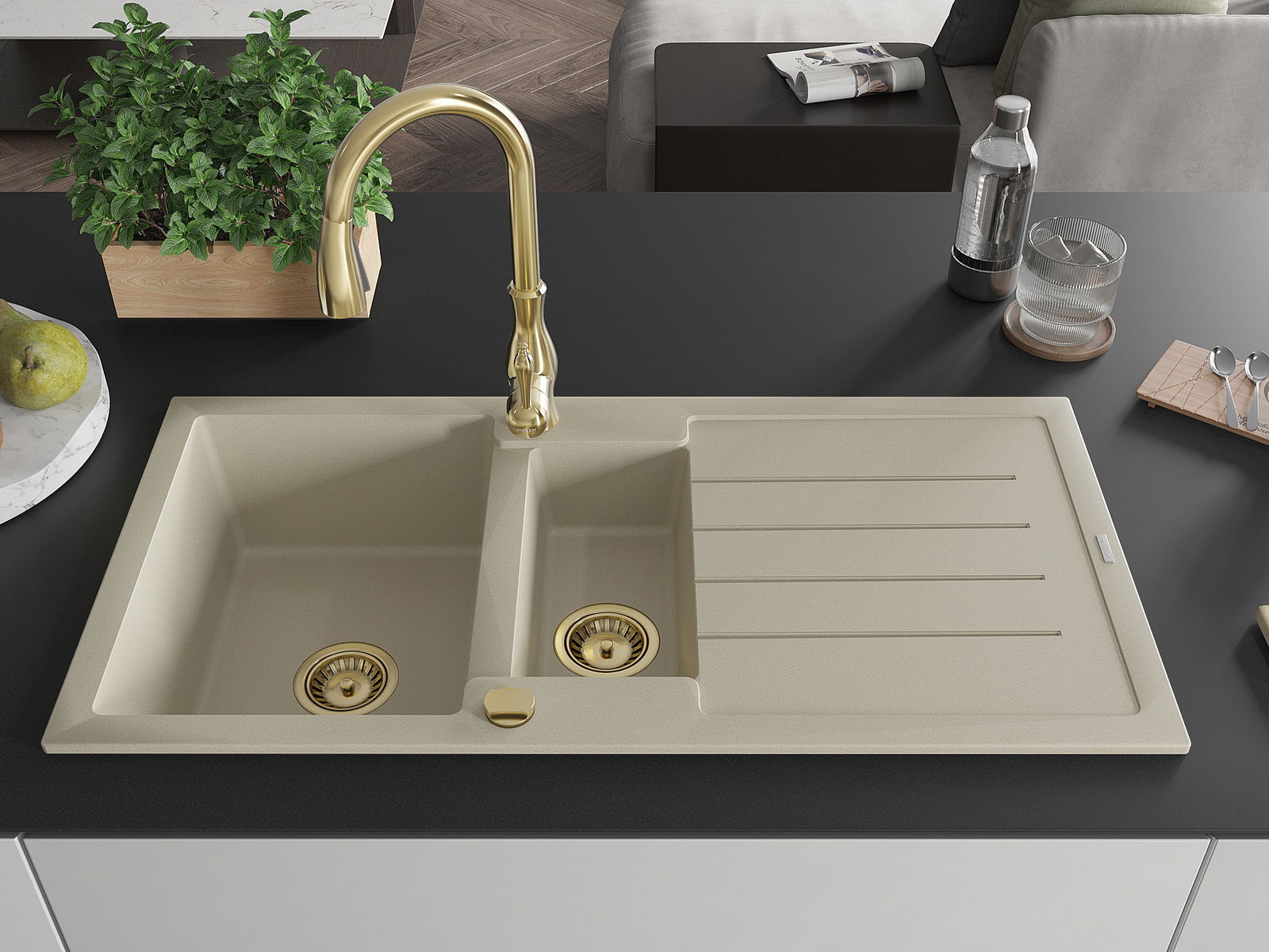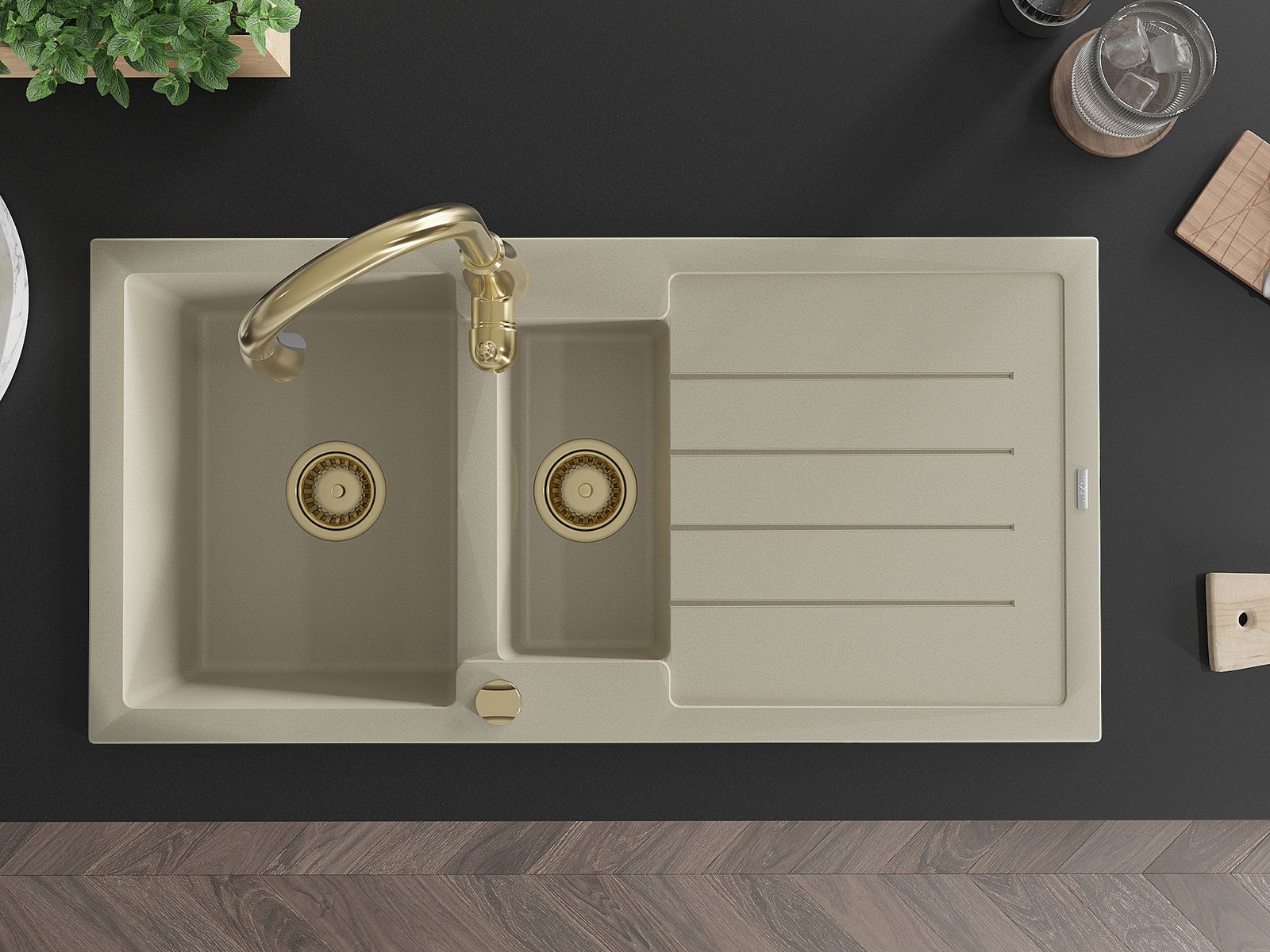 Mexen Andres fregadero de granito de 1,5 senos con escurridor y grifo de cocina Savita, beige - 6515-69-672601-50