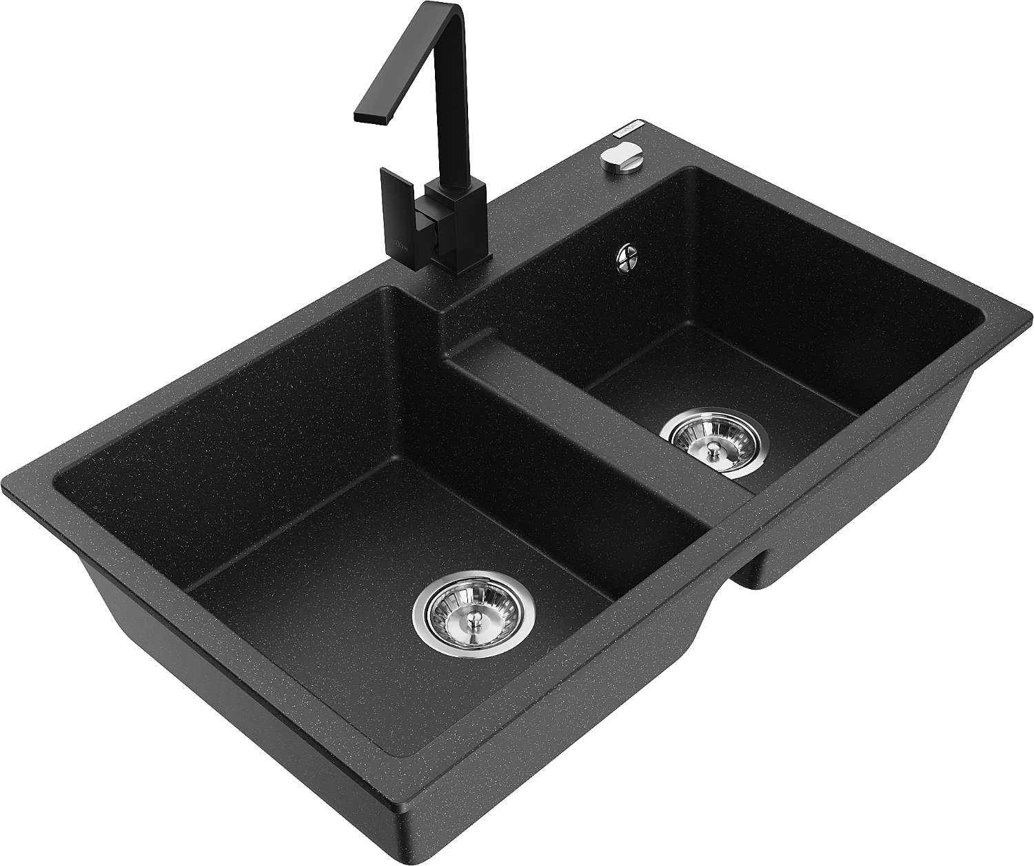Mexen Tomas fregadero de granito de 2 compartimentos con grifo de cocina Rita, negro/metálico plateado - 6516-73-670300-70