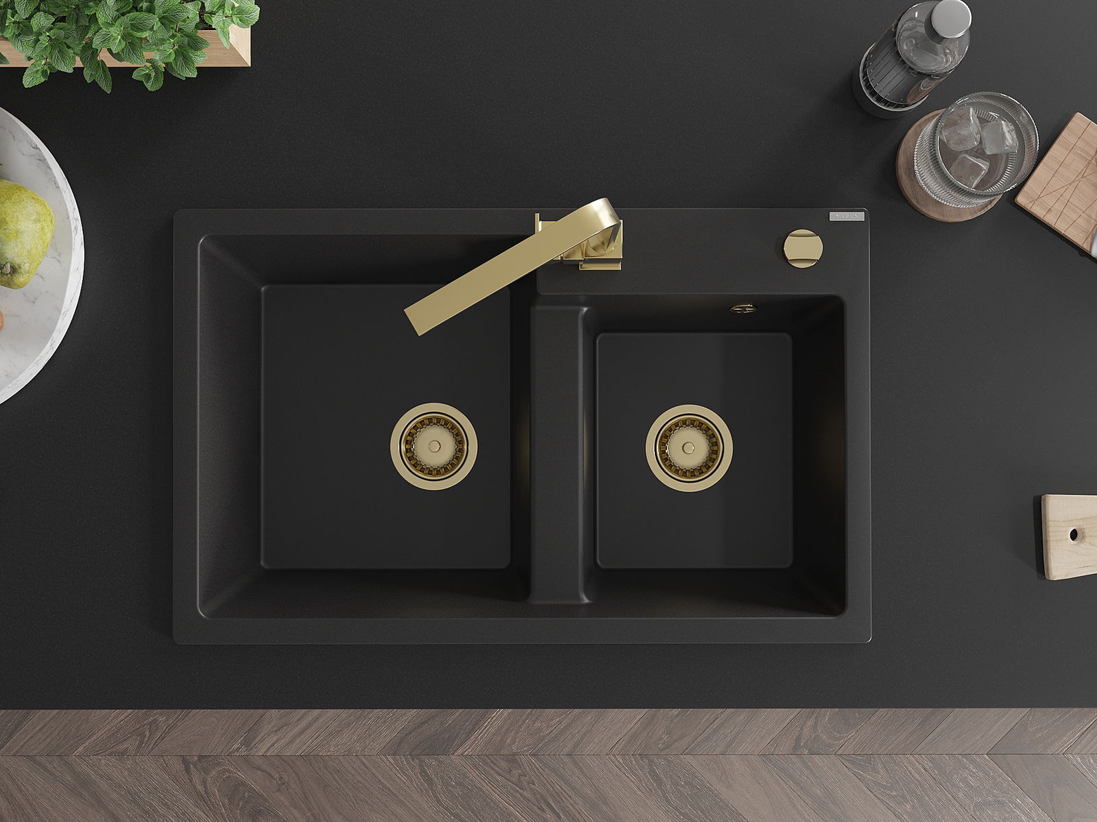 Mexen Tomas fregadero de granito de 2 compartimentos con grifo de cocina Rita, negro - 6516-77-670300-50