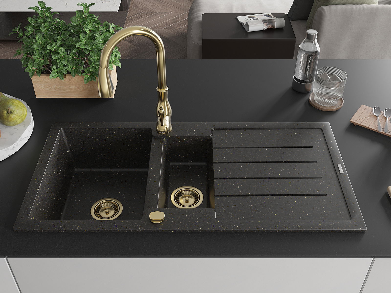 Mexen Andres fregadero de granito 1,5 senos con escurridor y grifo de cocina Savita, negro/oro metálico - 6515-75-672601-50
