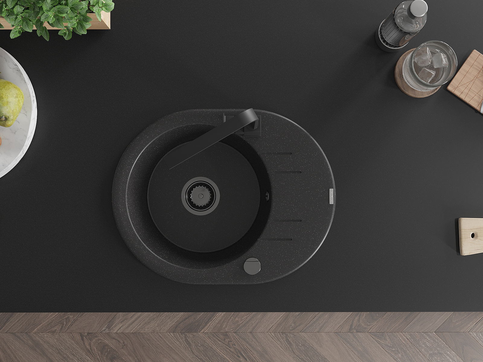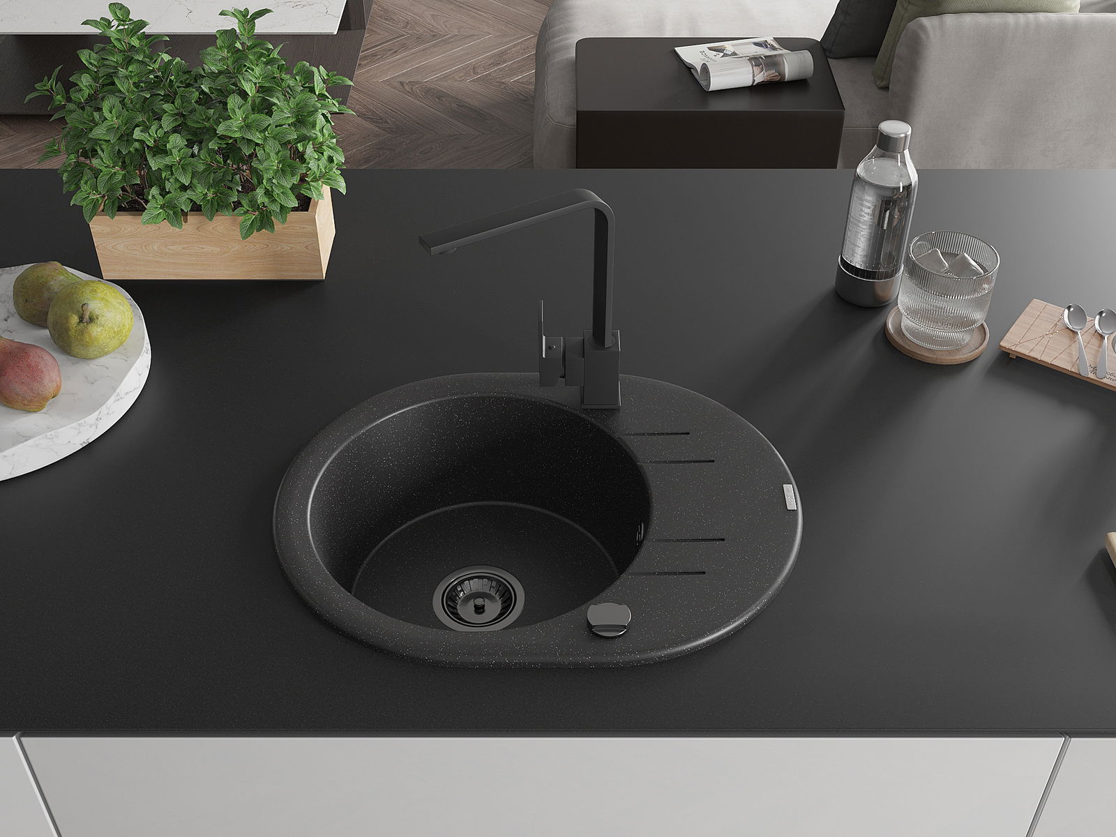 El fregadero está hecho de granito de alta calidad. Es un complemento elegante y, sobre todo, práctico para cualquier cocina, independientemente de su estilo. La alta calidad y durabilidad del granito aseguran un uso prolongado durante años.