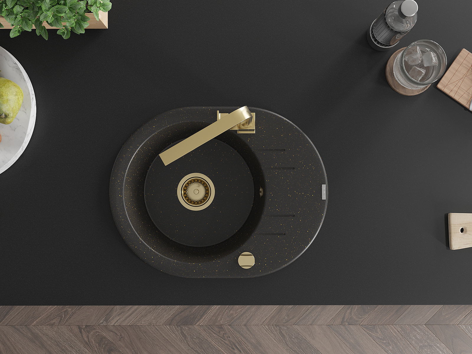 Mexen Kevin fregadero de granito 1-cubeta con escurridor y grifo de cocina Rita, negro/dorado metálico - 6517-75-670300-50