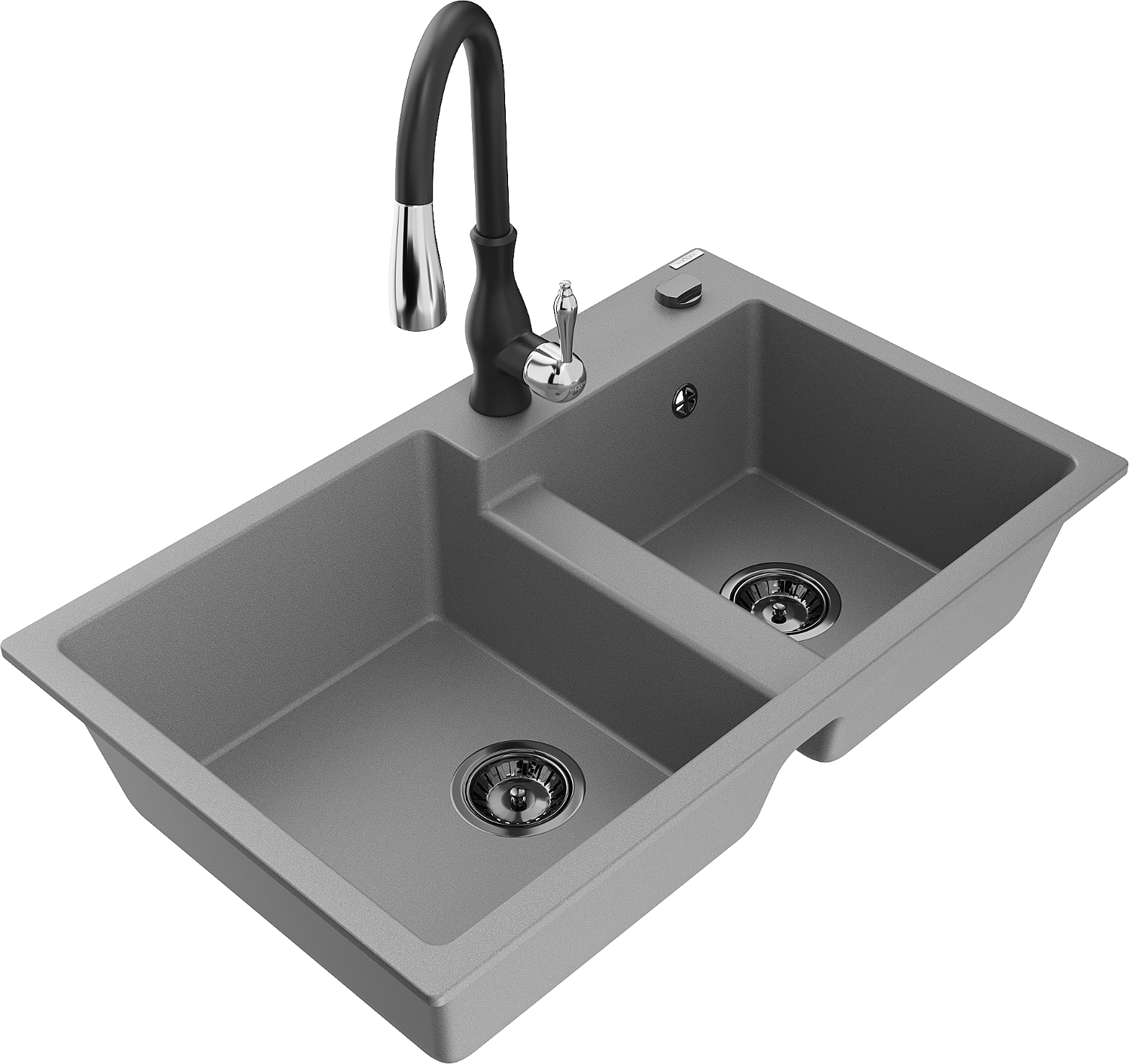 Mexen Tomas fregadero de granito de 2 cámaras con grifo de cocina Savita, gris - 6516-71-672601-70-B