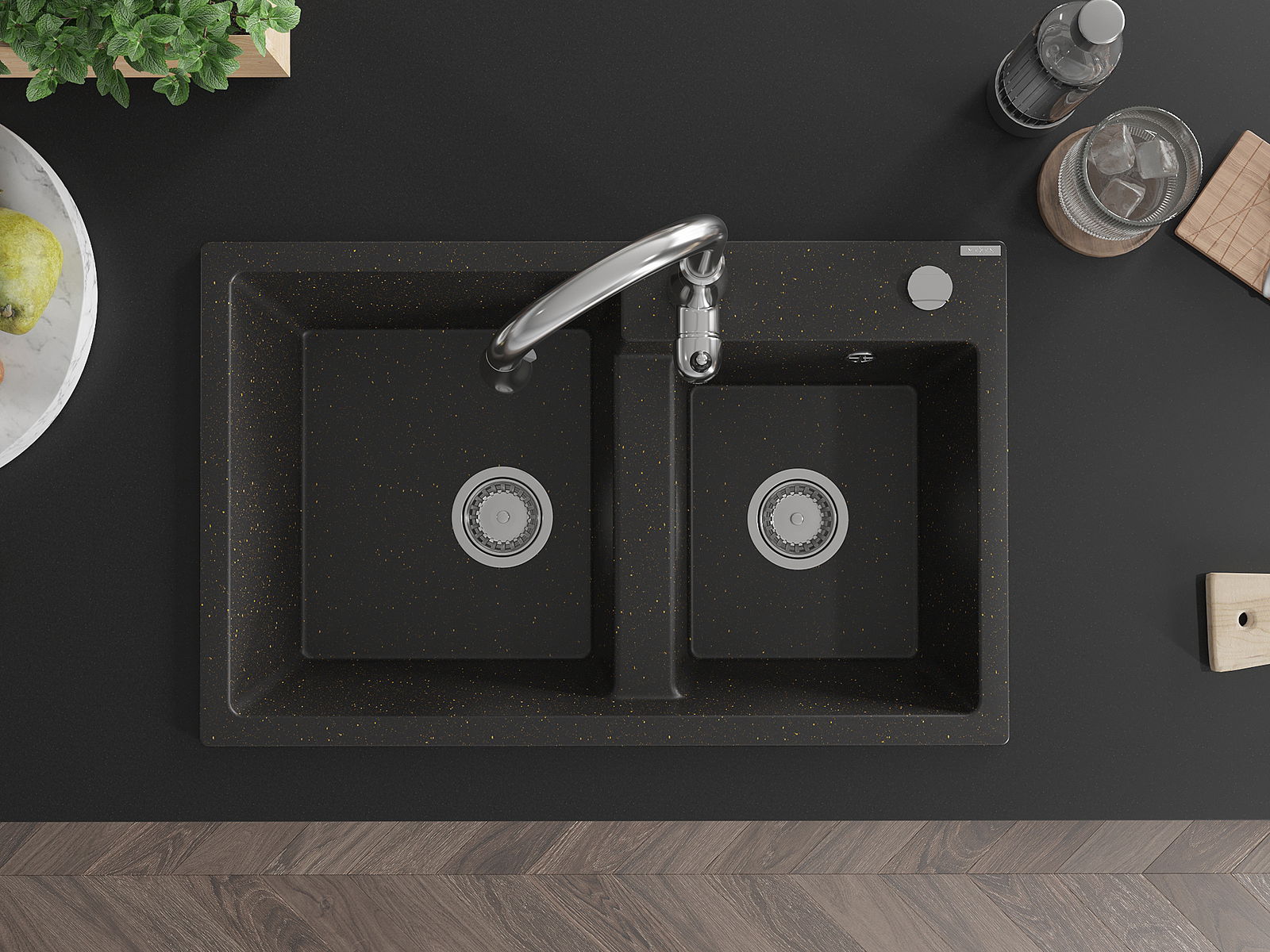 Mexen Tomas fregadero de granito de 2 senos con grifo de cocina Savita, negro/dorado metálico - 6516-75-672601-00